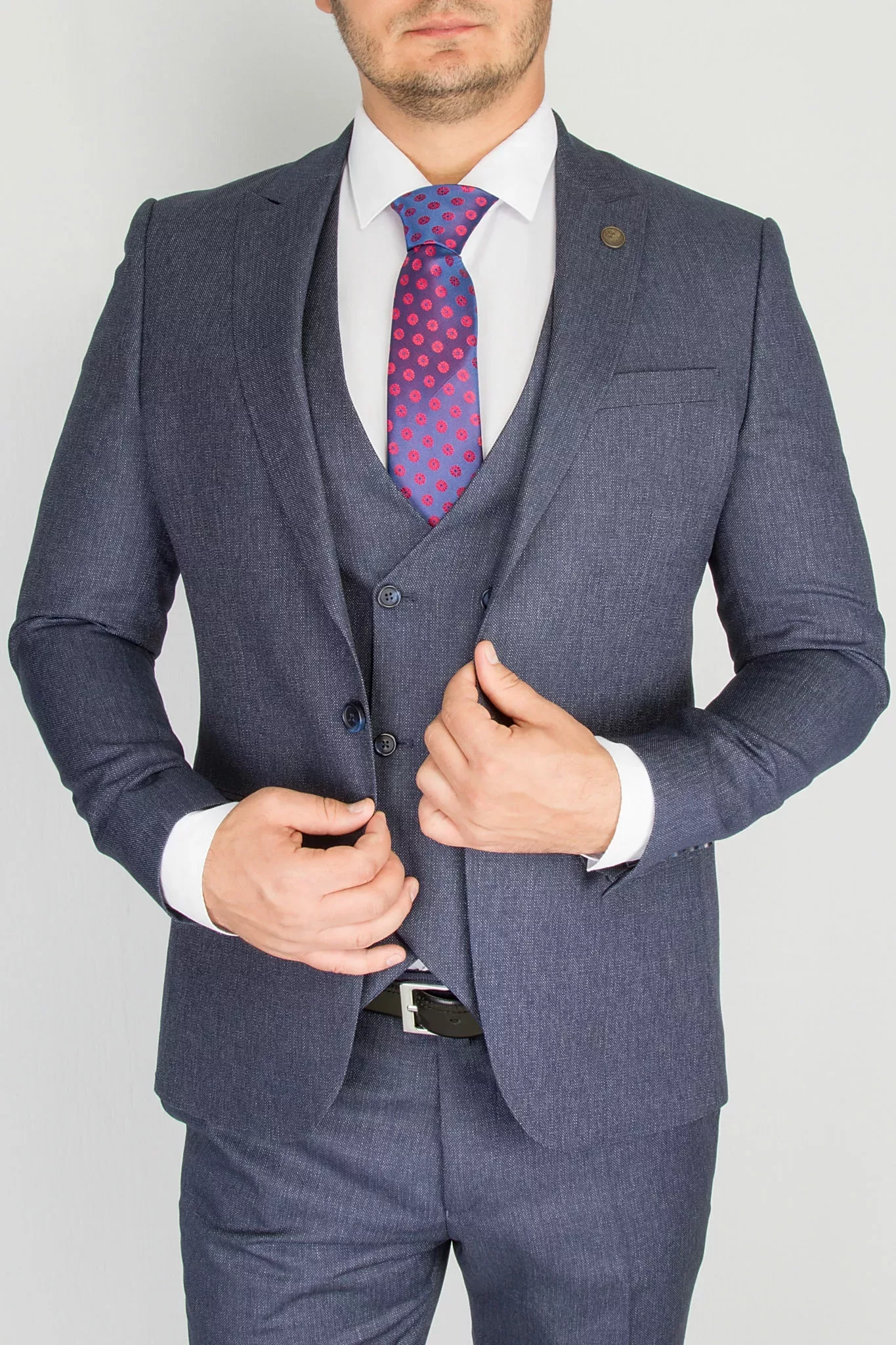 Приталенный костюм-тройка темно-синего цвета