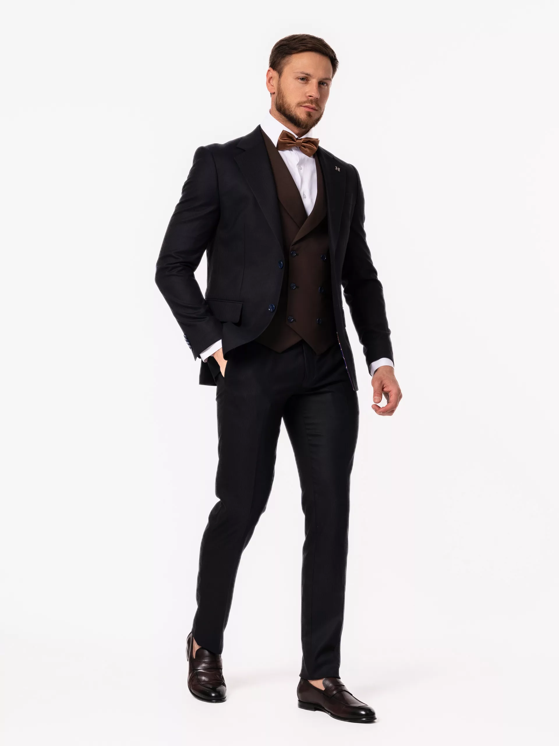 Костюм-тройка синего цвета с коричневым жилетом