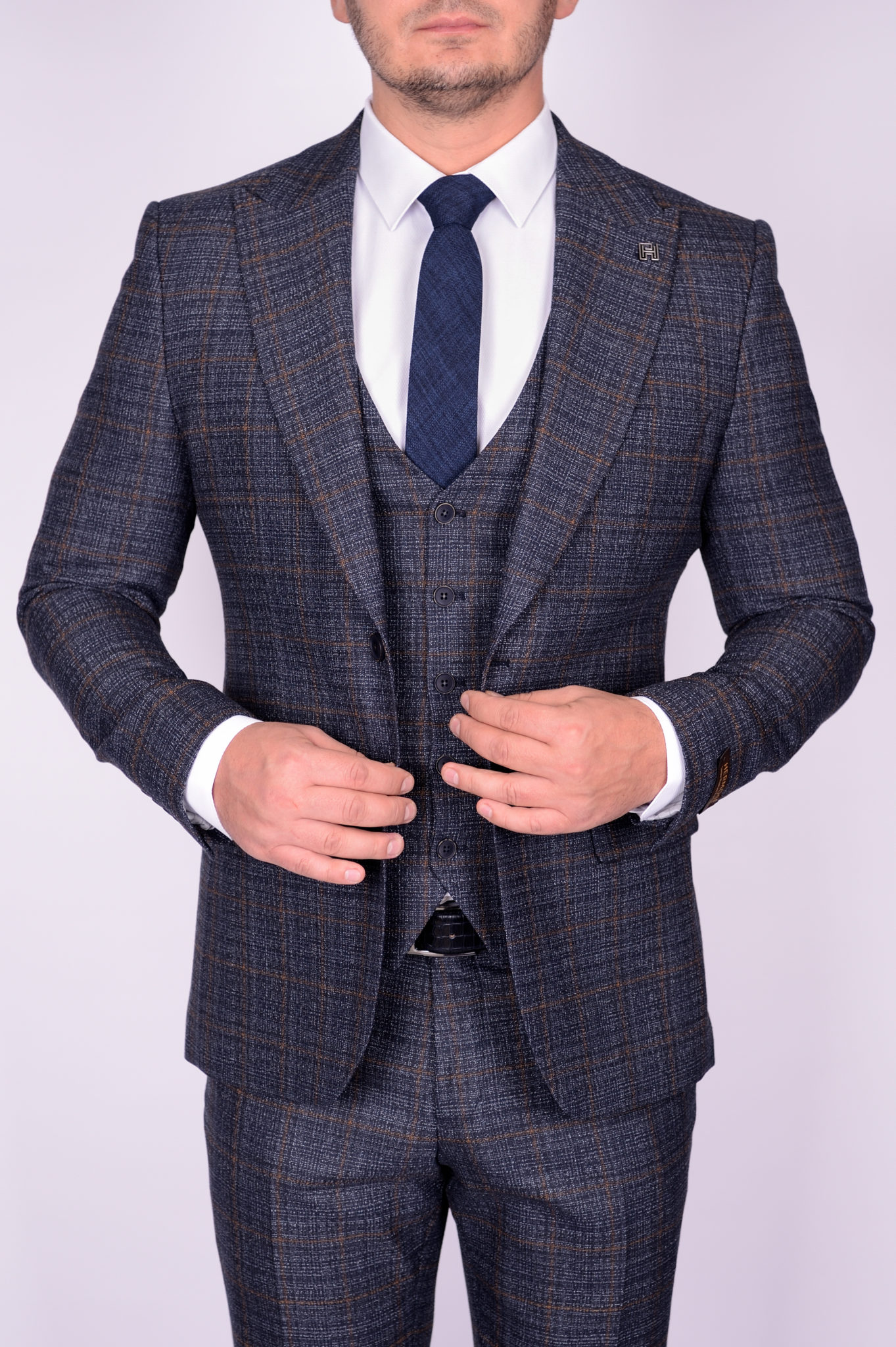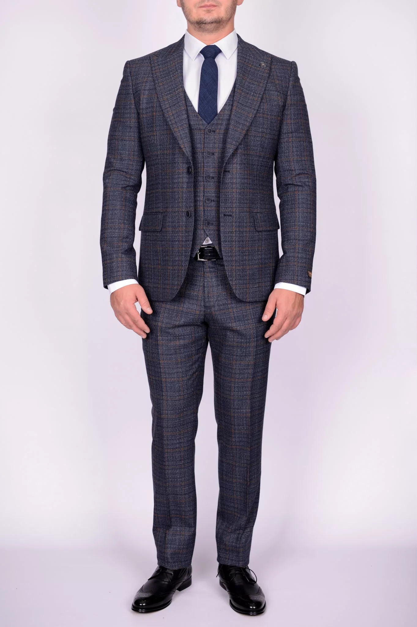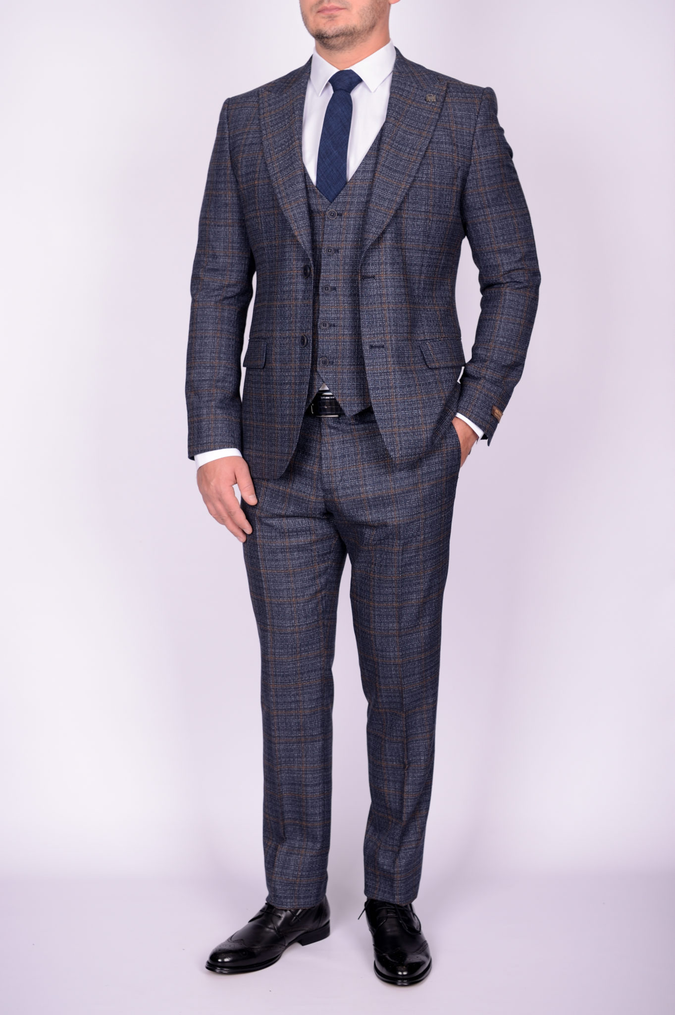 Костюм-тройка синего цвета с коричневой клеткой