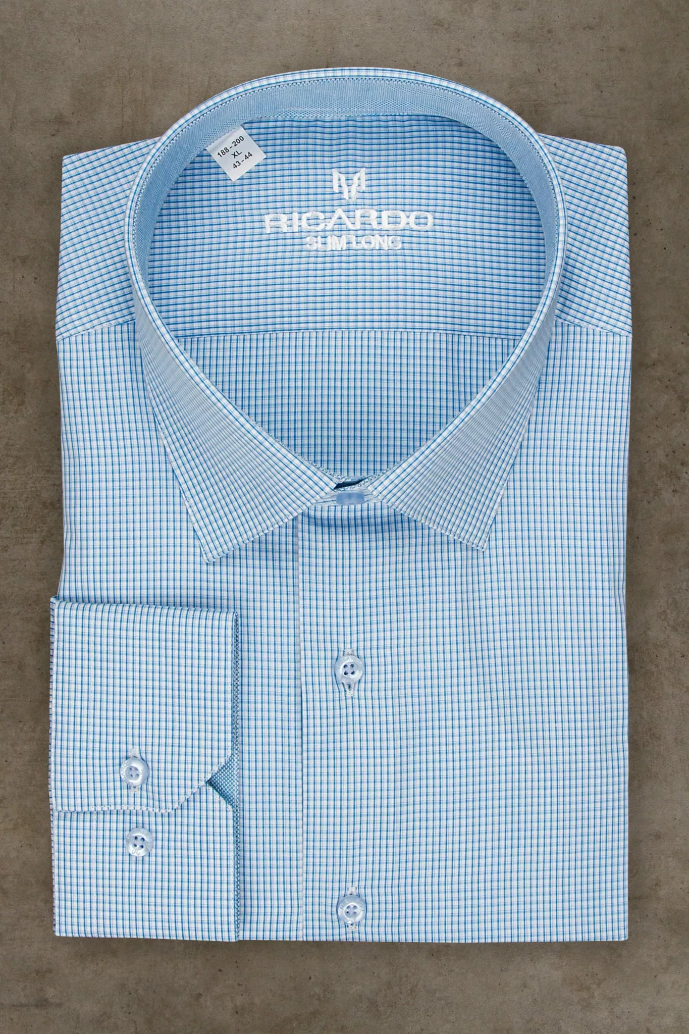 Рубашка белая в голубую клетку приталенная на высокий рост