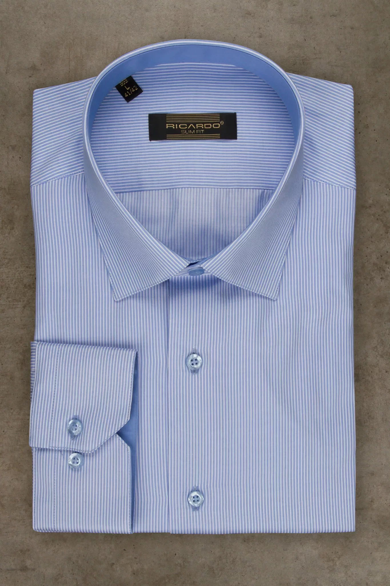 Перейти к товару Рубашка голубая в белую полосу, приталенная