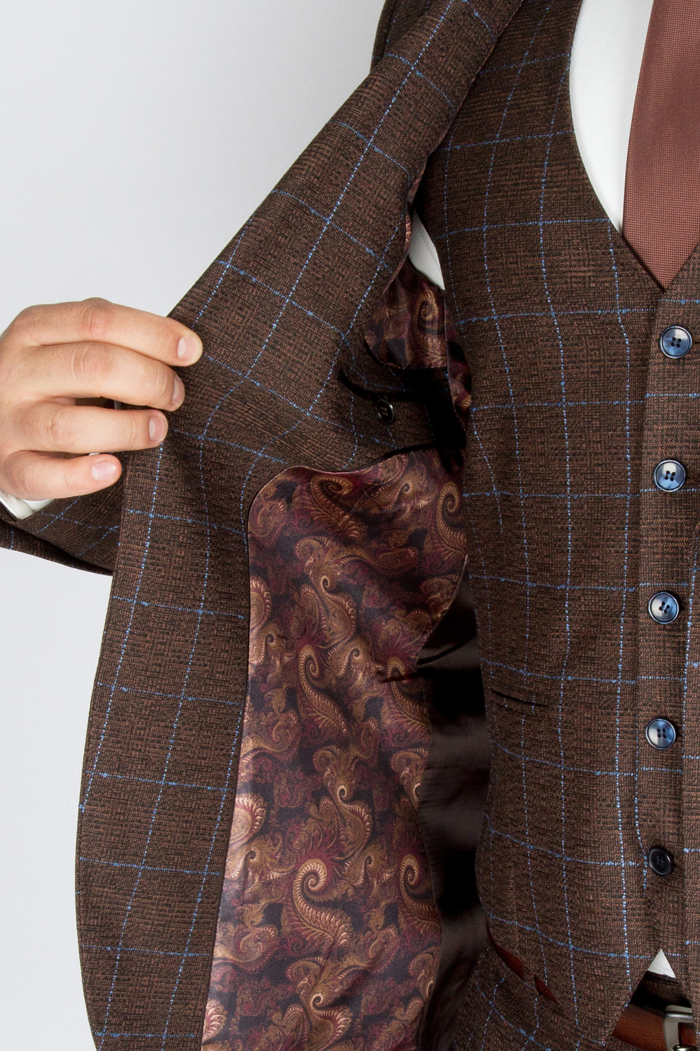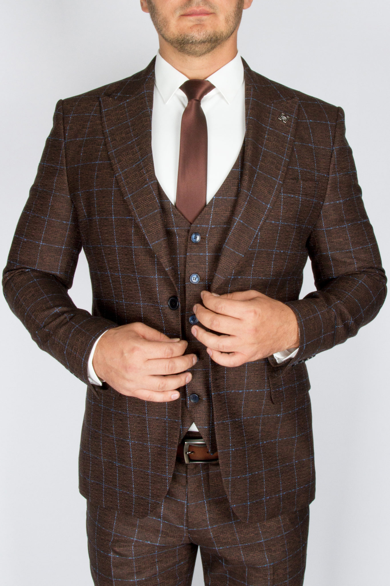 Перейти к товару Костюм-тройка шоколадного цвета в голубую клетку