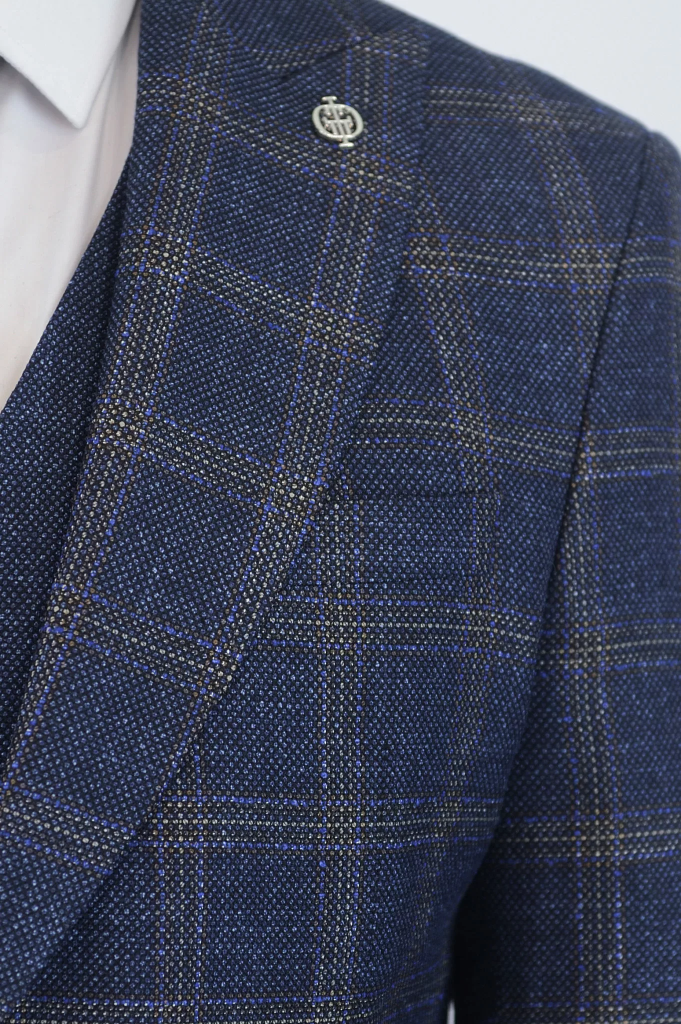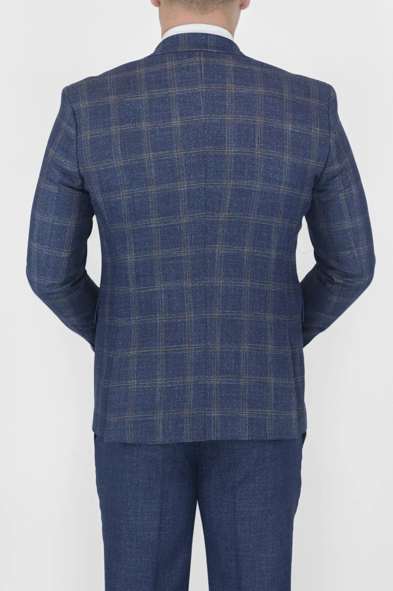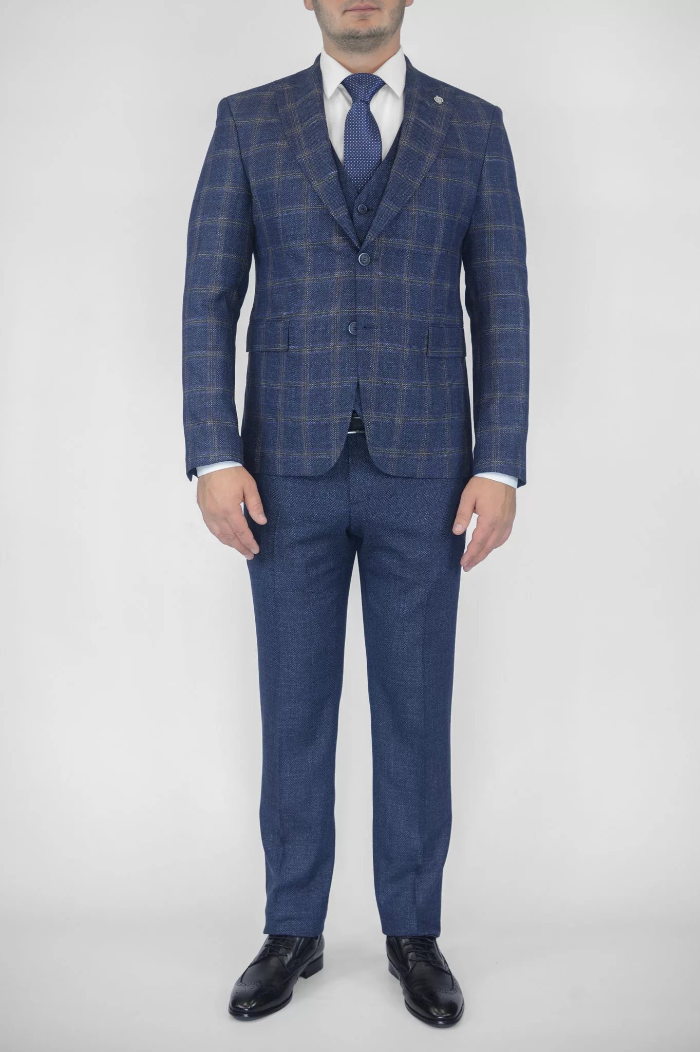 Данная модель имеет универсальный синий цвет и выгодную комбинацию клеточного пиджака и однотонного низа. Вы будете отлично выглядеть в нем как на торжественных мероприятиях, так  и в офисе.