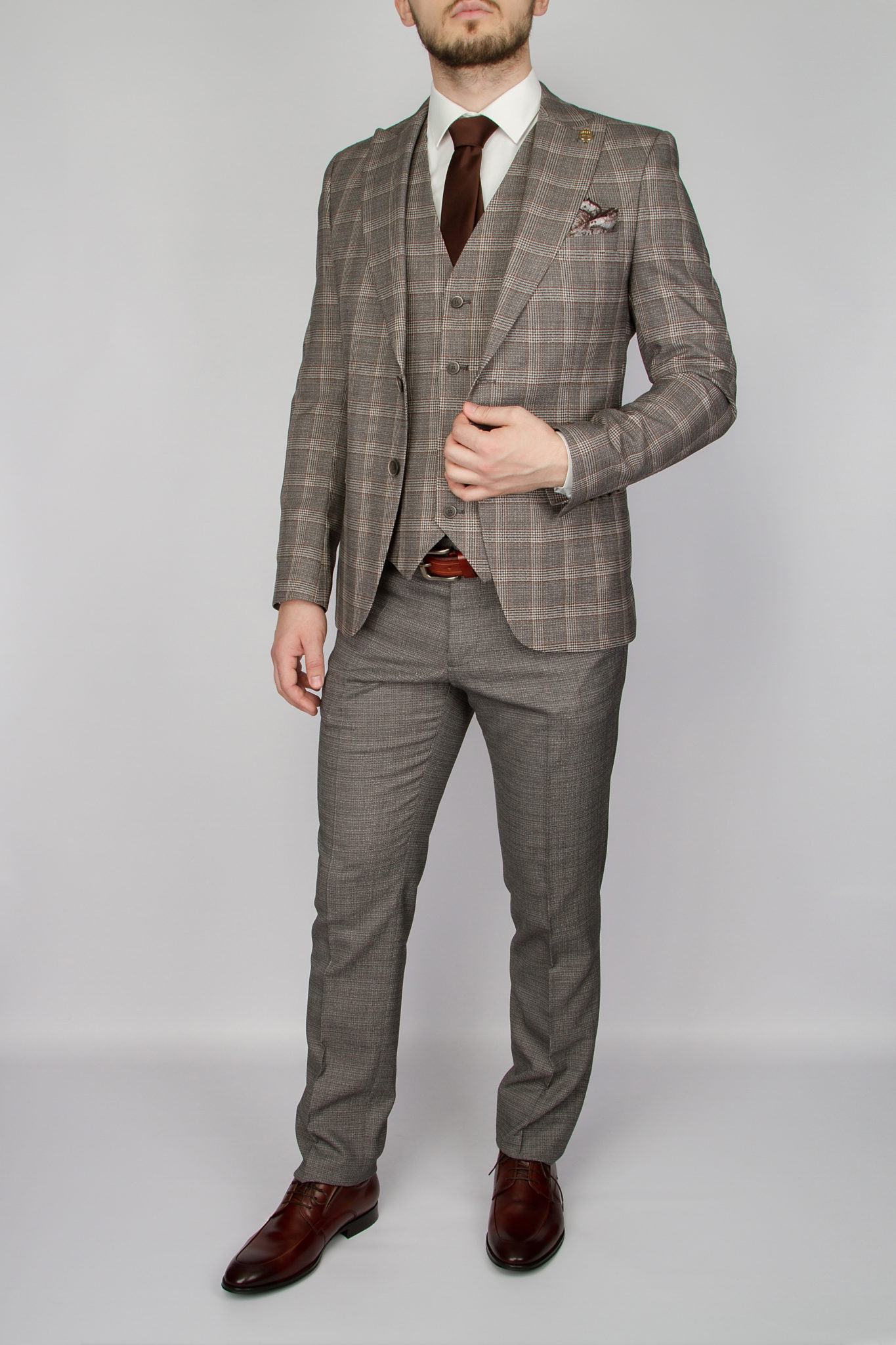 Клетчатый костюм-тройка серого цвета