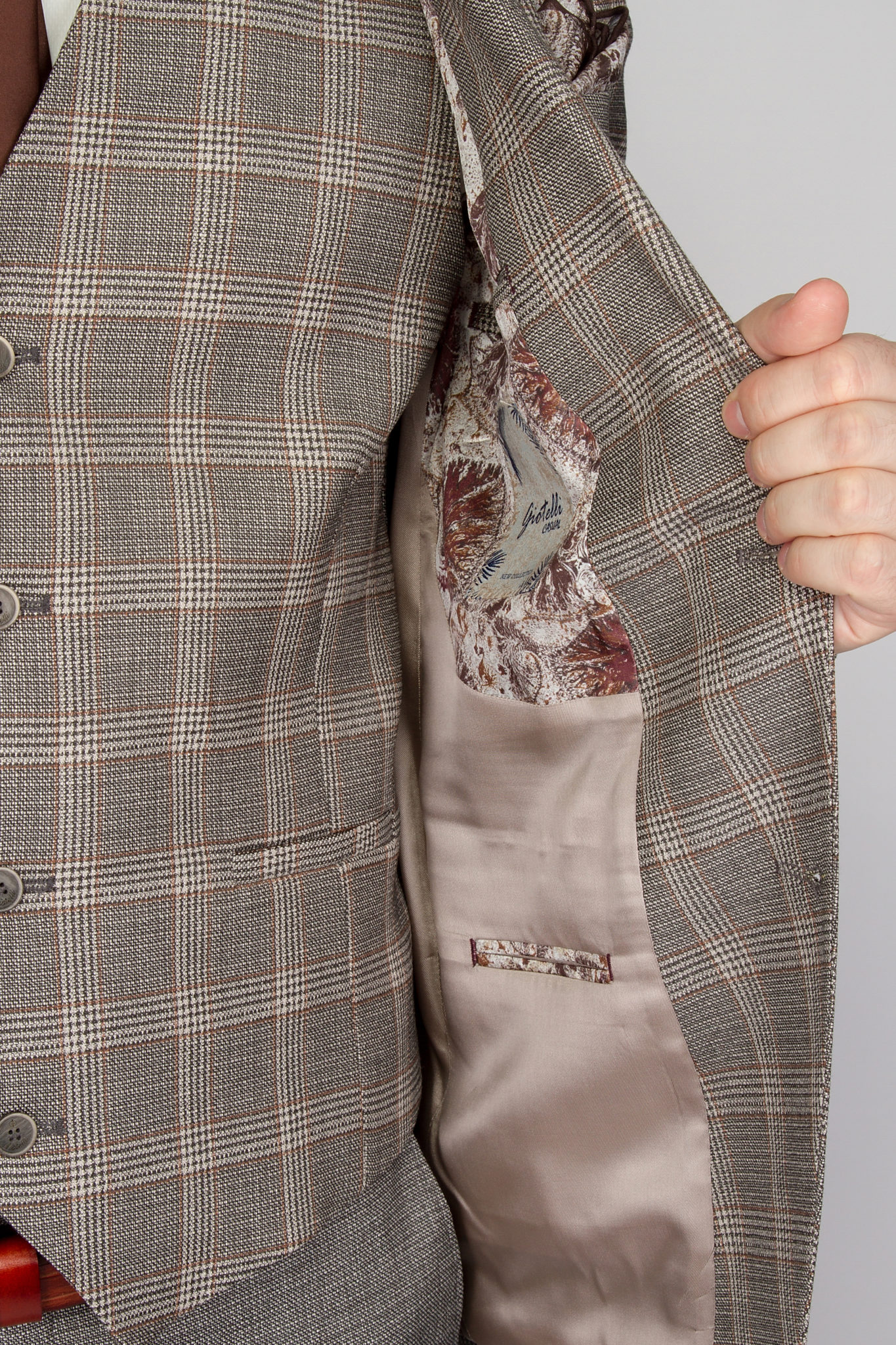Костюм отшит в приталенной модели super-slim. Пиджак имеет застежку на две пуговицы, заостренный лацкан воротника (ласточка), значек в петлице. Жилет однобортный с регулятором обьема, задняя часть из основной ткани верха (не вискоза).  Брюки современного, приуженного кроя, имеют свободную длину. По вашей просьбе мы бесплатно подгоним длину брюк под вашу ростовку. Костюм отшит из смесовой ткани высокого качества в составе 80% шерсти и 15% вискозы и 5% эластан, что позволяет долго сохранять презентабельный внешний вид и форму, ткань устойчива к заминанию. Костюм отшит в модели » компаньон», пиджак с жилетом в клетку, брюки однотонные, все подобрано строго в тон.