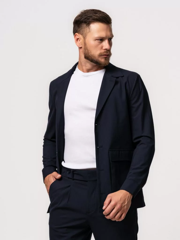Костюм отшит в современной модели свободного кроя. Пиджак облегченный с накладными карманами. Брюки умеренно свободные с манжетом . Костюм отшит из смесовой ткани высокого качества в составе 65% шерсти и 30% вискозы и 5% эластан , что позволяет долго сохранять презентабельный внешний вид и форму, ткань устойчива к заминанию. Костюм темно-синего цвета и практически не стесняет движений.