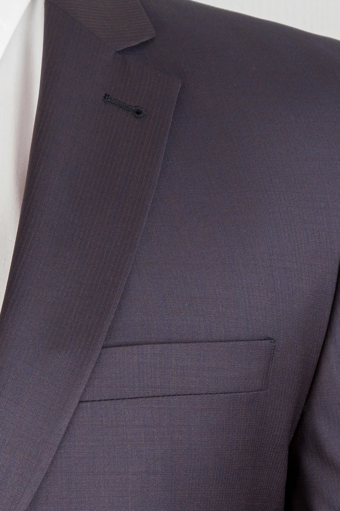 Костюм-двойка темно-фиолетового цвета в неброскую полосу. Костюм отшит в полуприталенной модели regular fit. Пиджак имеет «плотную посадку» по фигуре, застежку на две пуговицы, два разреза сзади. Лацкан пиджака приужен, сзади два разреза. Брюки прямые, имеют свободную длинну. По вашей просьбе мы подгоним длину брюк под ваш рост.