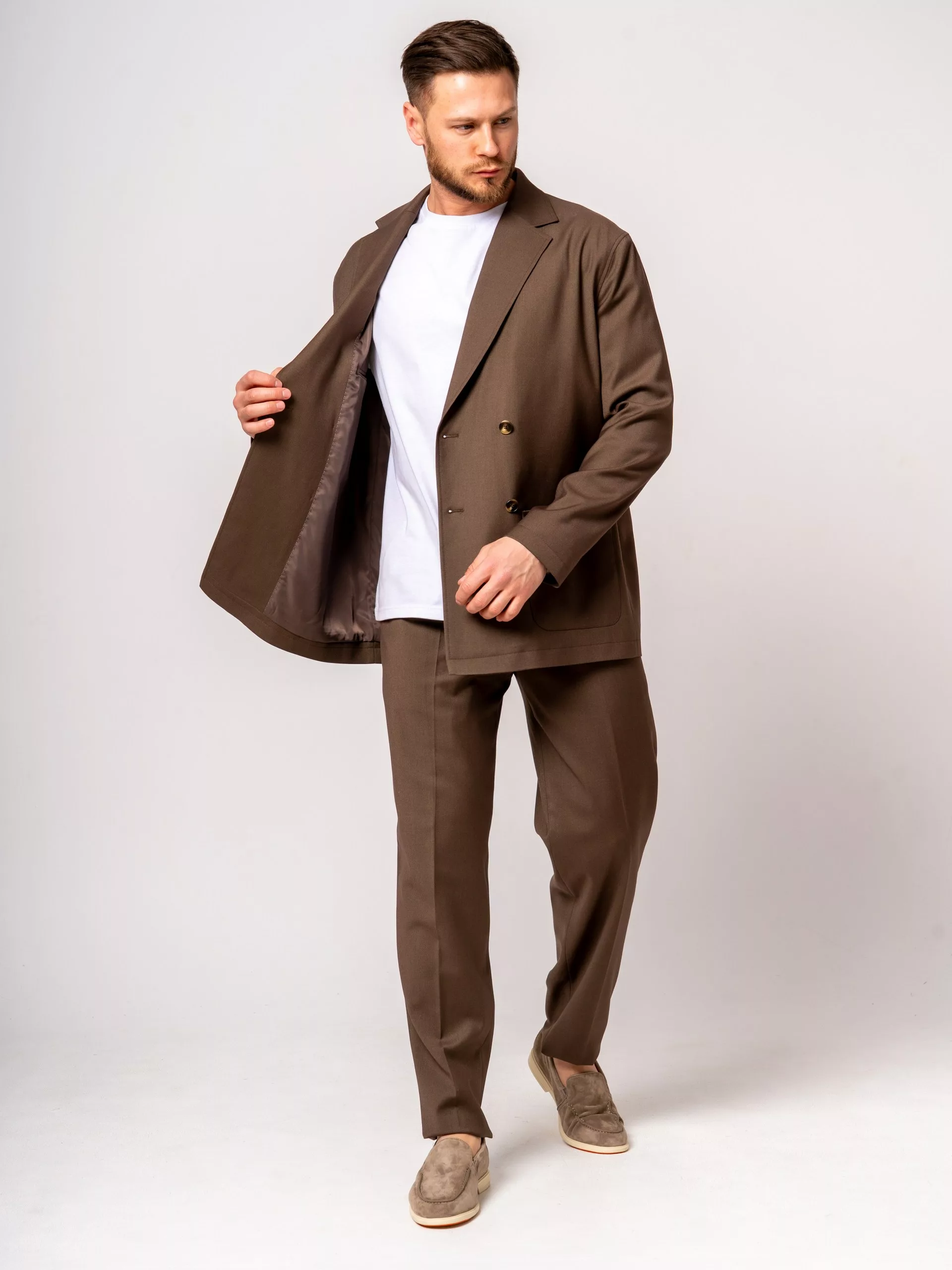 Костюм-двойка модель oversize. Пиджак двубортный, ворот-классический английский крой. Брюки свободного кроя, имеют свободную длину. По вашей просьбе мы бесплатно подгоним длину брюк под вашу ростовку. Костюм отшит из облегченной смесовой ткани высокого качества в составе 65% шерсти и 30% вискозы и 5% эластан, что позволяет долго сохранять презентабельный внешний вид и форму, ткань устойчива к заминанию. Костюм отшит из облегченной, летней ткани, спина без подкладки.