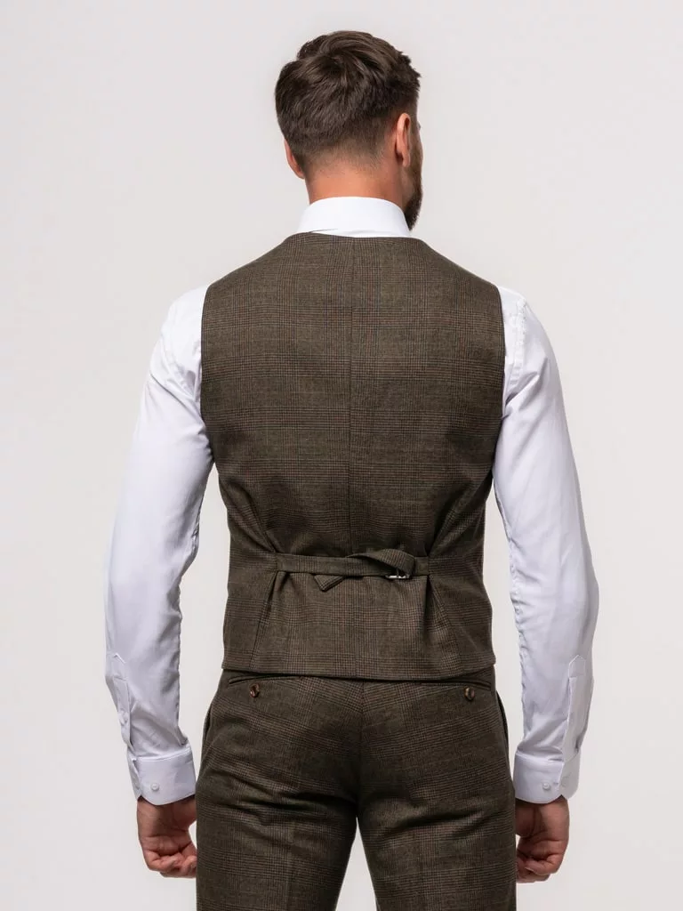 Костюм имеет замечательную посадку, отлично садится практически на любой тип фигуры.Выглядит свежо и оригинально. Жилет костюма по спине также тканевый, что позволяет использовать его отдельно только с брюками. Костюм уникального, очень красивого болотного оттенка на фото не передается вся красота…