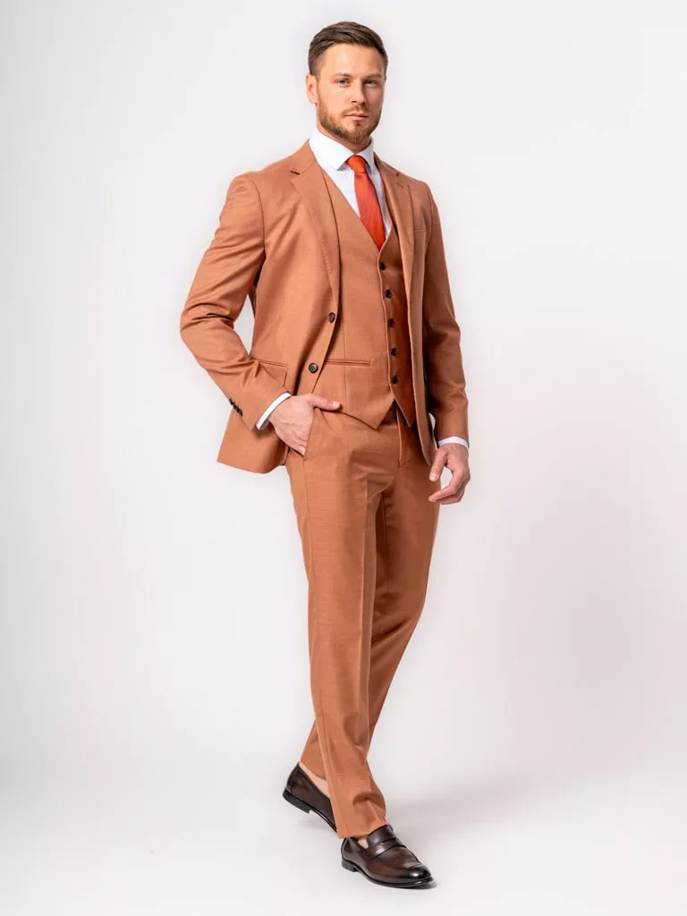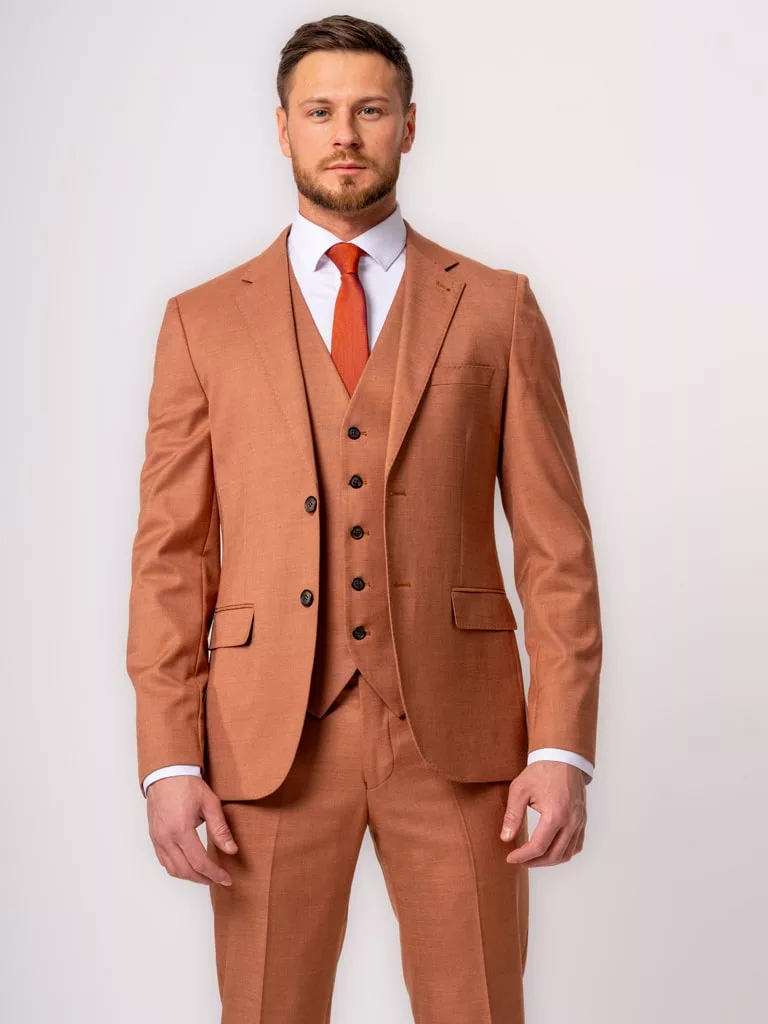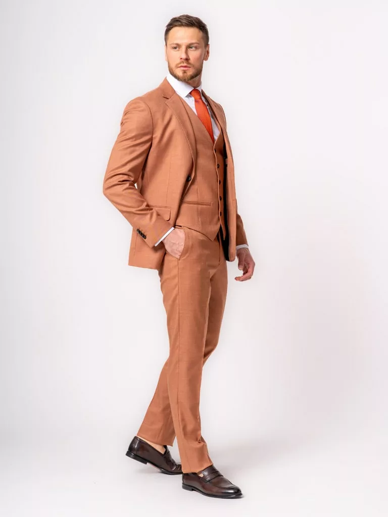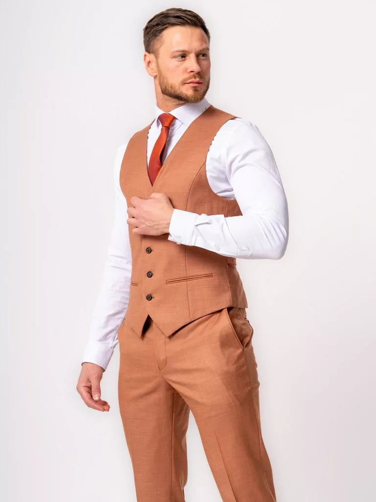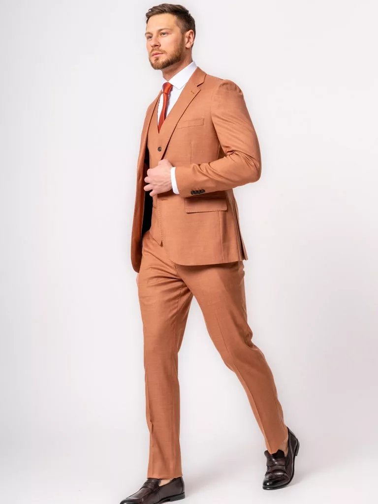 Костюм-тройка отшит в приталенной модели super-slim. Пиджак имеет застежку на две пуговицы, английский воротник, две шлицы. Жилет двубортный с отложным воротником, задняя часть из основной ткани верха (не вискоза).  Брюки современного, прямого кроя, имеют свободную длину. По вашей просьбе мы бесплатно подгоним длину брюк под вашу ростовку. Костюм отшит из смесовой ткани высокого качества в составе 80% шерсти и 20% вискозы, что позволяет долго сохранять презентабельный внешний вид и форму, ткань устойчива к заминанию. Костюм отшит из облегченной, летней ткани, в персиковом цвете.