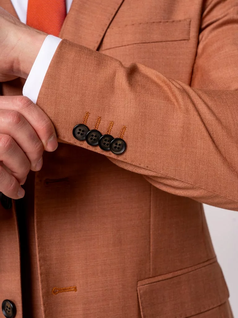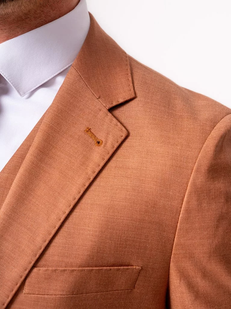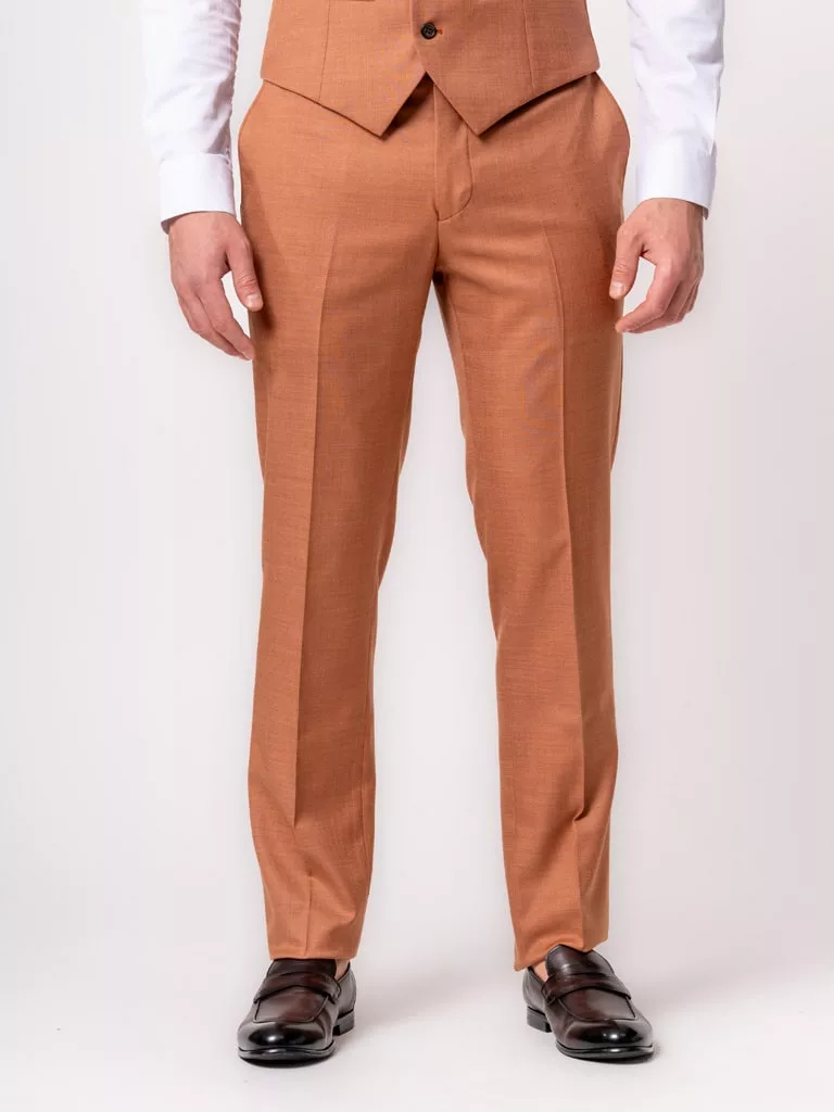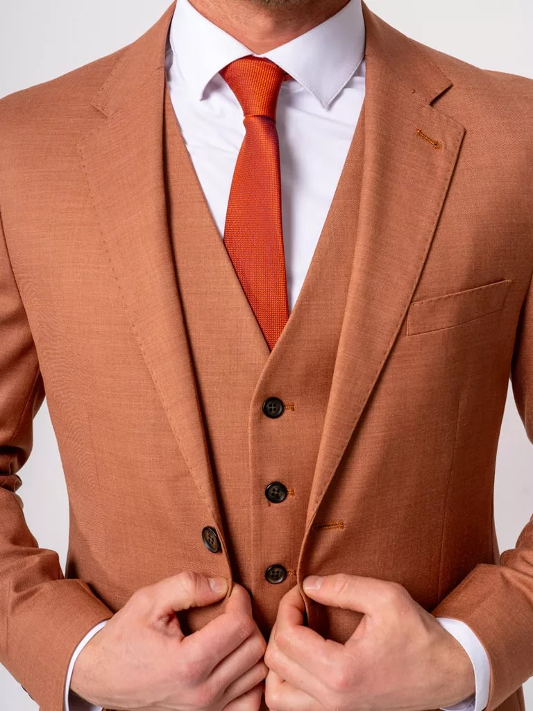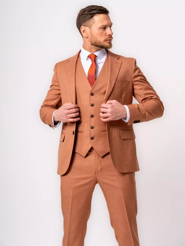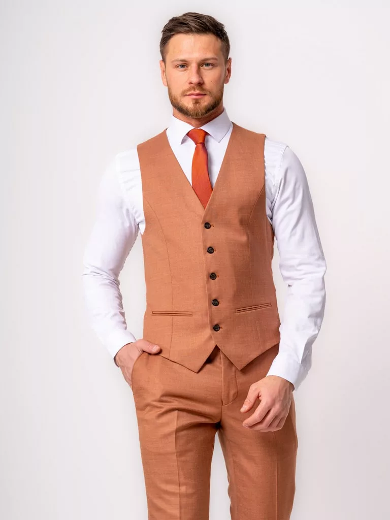 Костюм-тройка отшит в приталенной модели super-slim. Пиджак имеет застежку на две пуговицы, английский воротник, две шлицы. Жилет двубортный с отложным воротником, задняя часть из основной ткани верха (не вискоза).  Брюки современного, прямого кроя, имеют свободную длину. По вашей просьбе мы бесплатно подгоним длину брюк под вашу ростовку. Костюм отшит из смесовой ткани высокого качества в составе 80% шерсти и 20% вискозы, что позволяет долго сохранять презентабельный внешний вид и форму, ткань устойчива к заминанию. Костюм отшит из облегченной, летней ткани, в персиковом цвете.