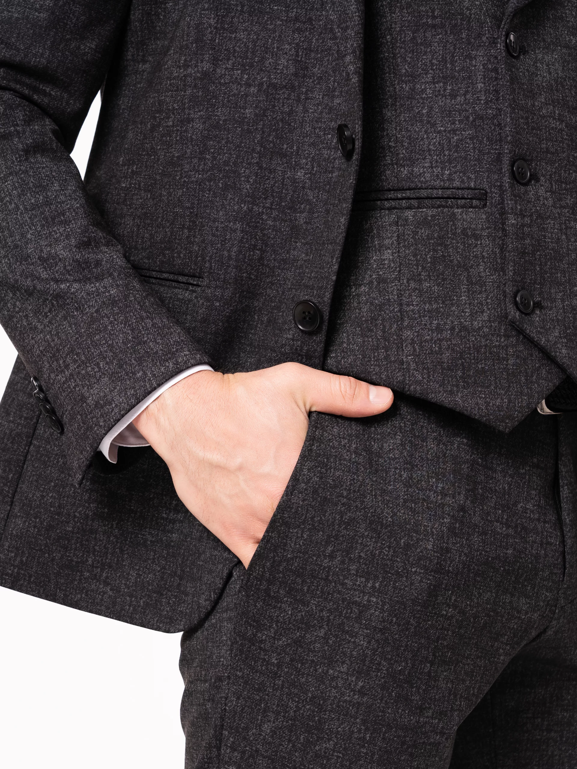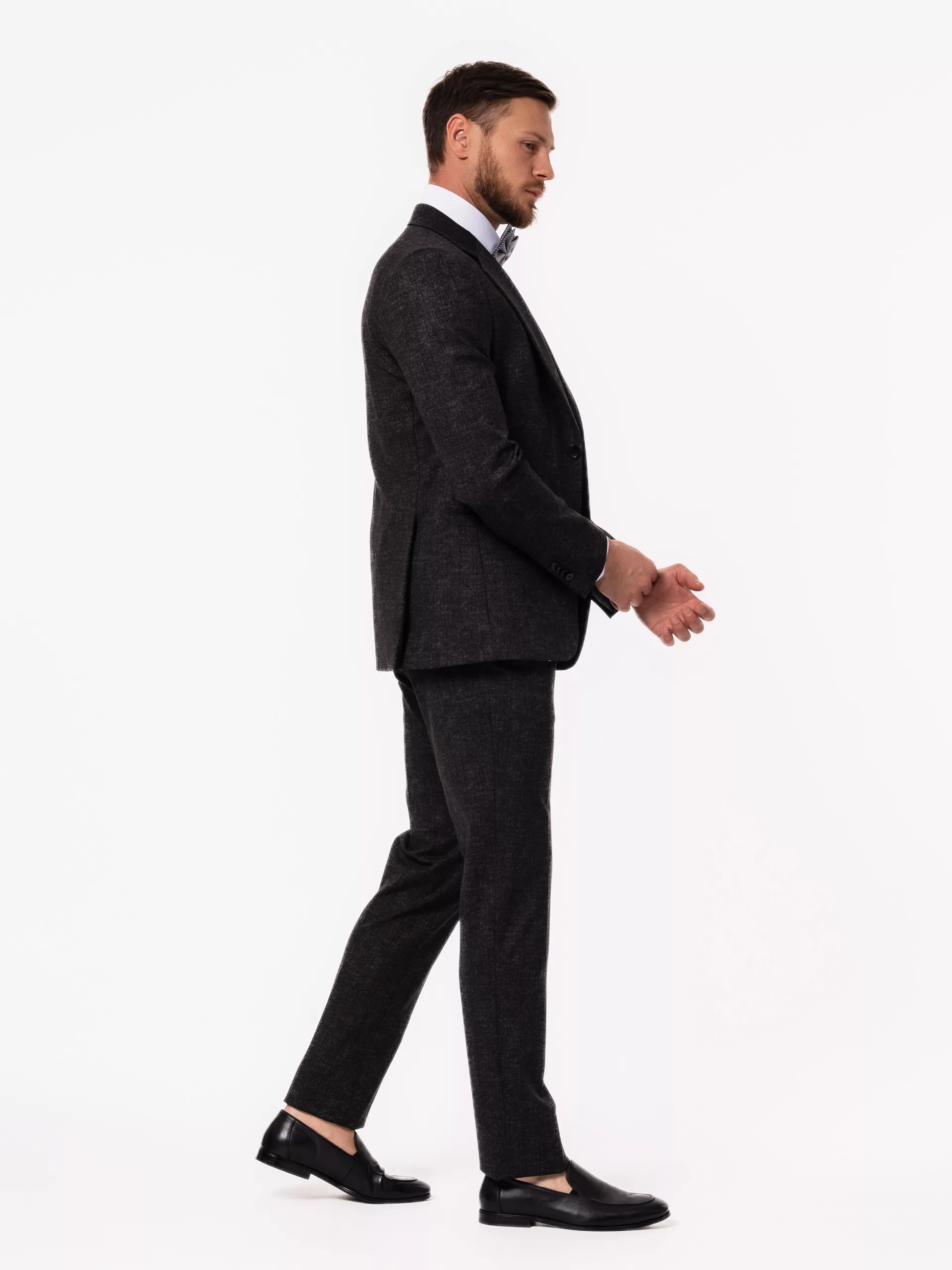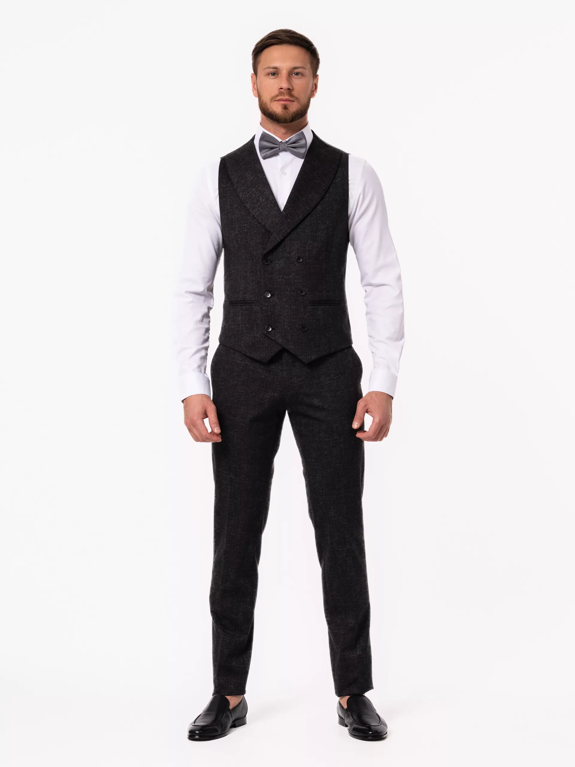 Костюм имеет замечательную посадку, отлично садится практически на любой тип фигуры. Данная модель отшита в очень редком и красивом графитовом оттенке, ткань имеет структурный рисунок, отлично подойдет для офиса и повседневной носки. Жилет костюма по спине также тканевый, что позволяет использовать его отдельно только с брюками.