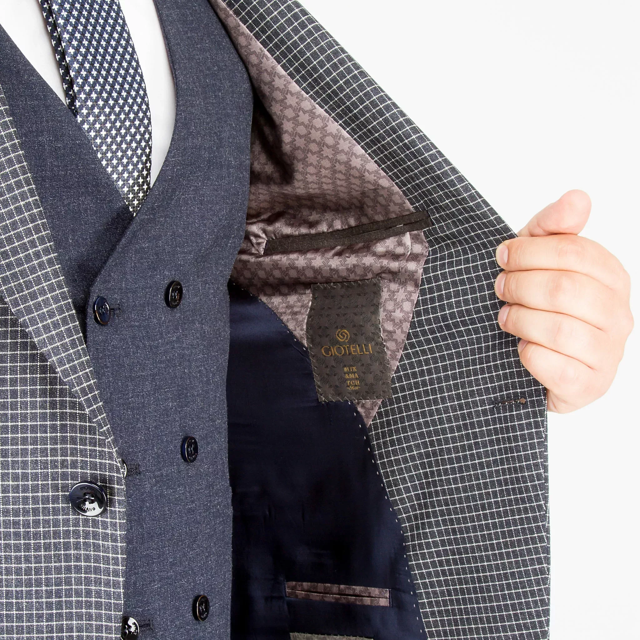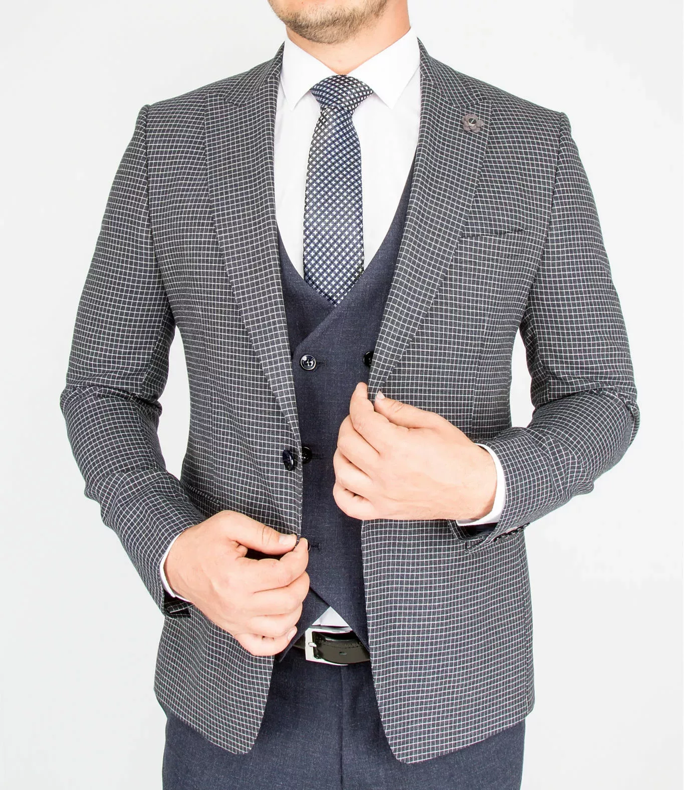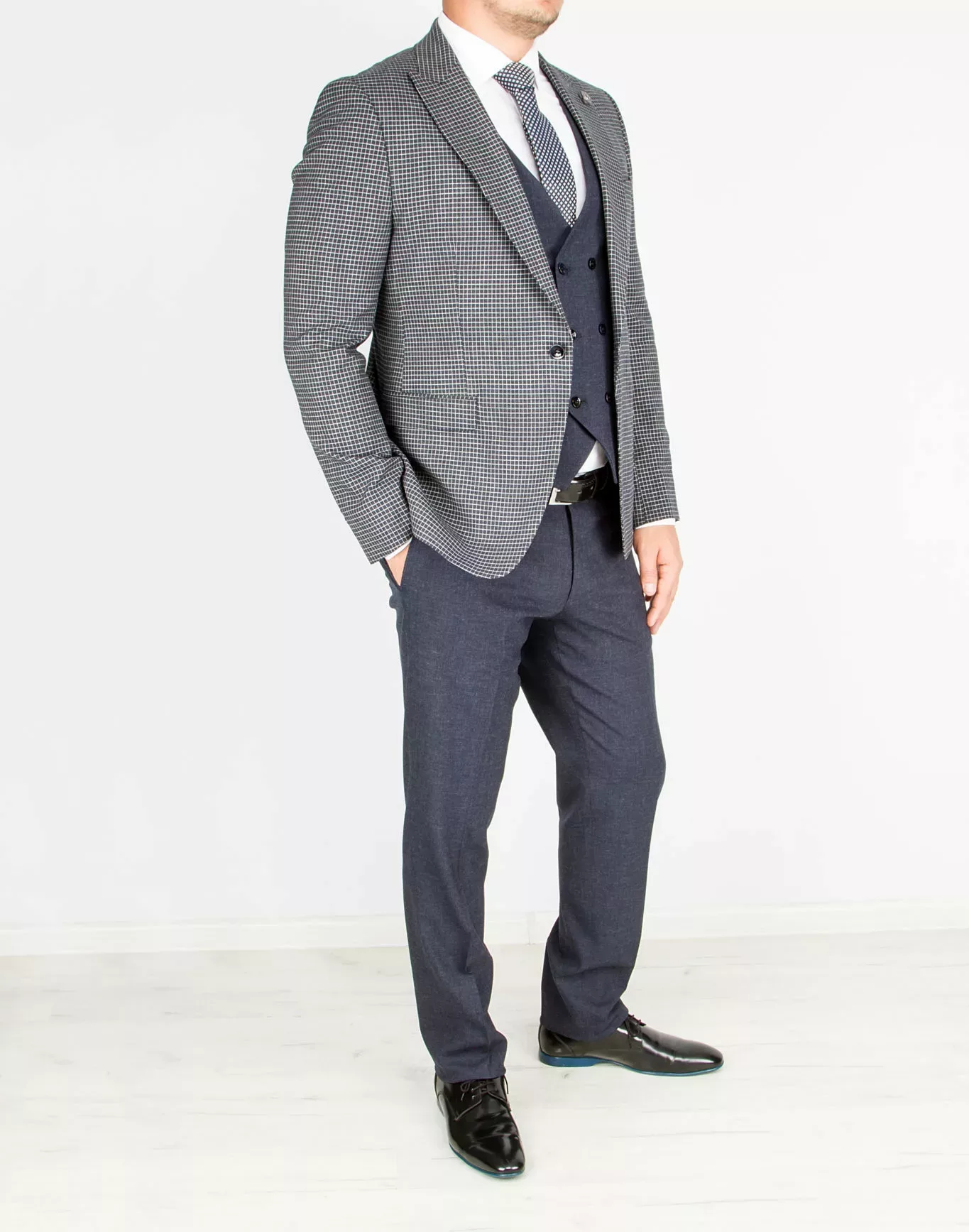 Костюм отшит в приталенной модели super-slim. Пиджак имеет застежку на одну пуговицу, узкий лацкан воротника, нагрудный карман с листочкой,  сзади две боковые шлицы. Брюки имеют свободную длину. По вашей просьбе мы бесплатно подгоним длину брюк под вашу ростовку. Костюм отшит из плотной ткани, которая очень хорошо держит форму, в связи с чем данная модель обладает безупречной посадкой. В костюме очень выгодно сочетается пиджак в клетку с однотонным жилетом и брюками.
