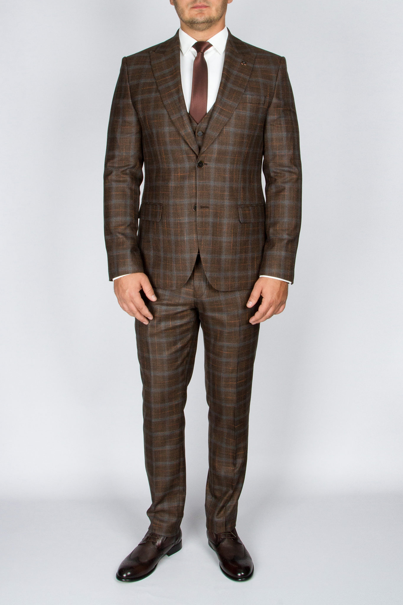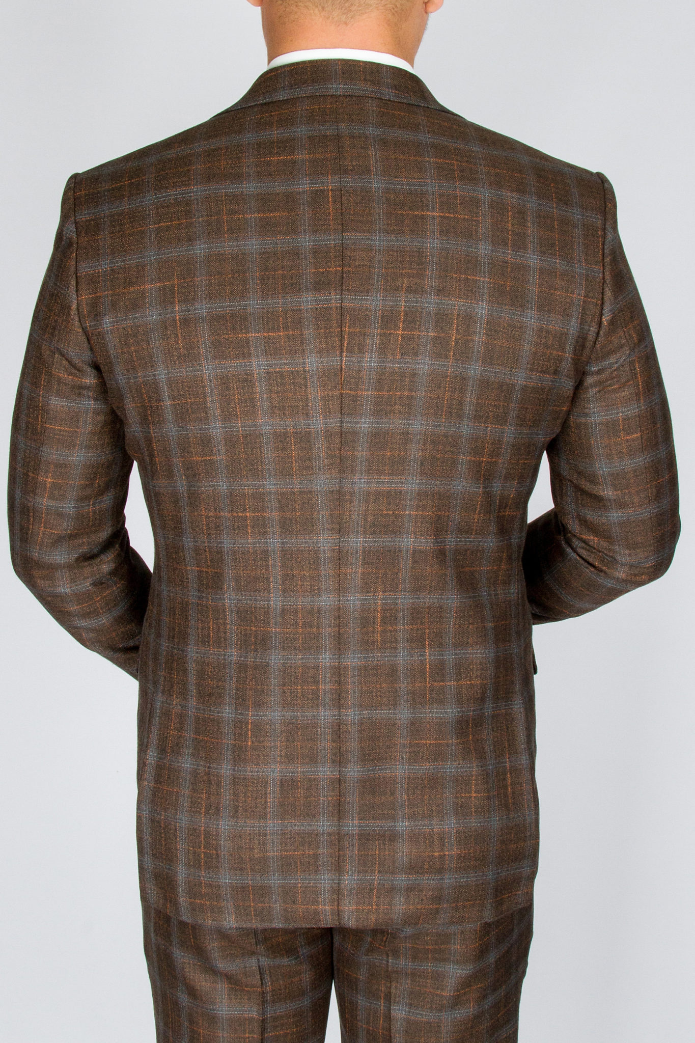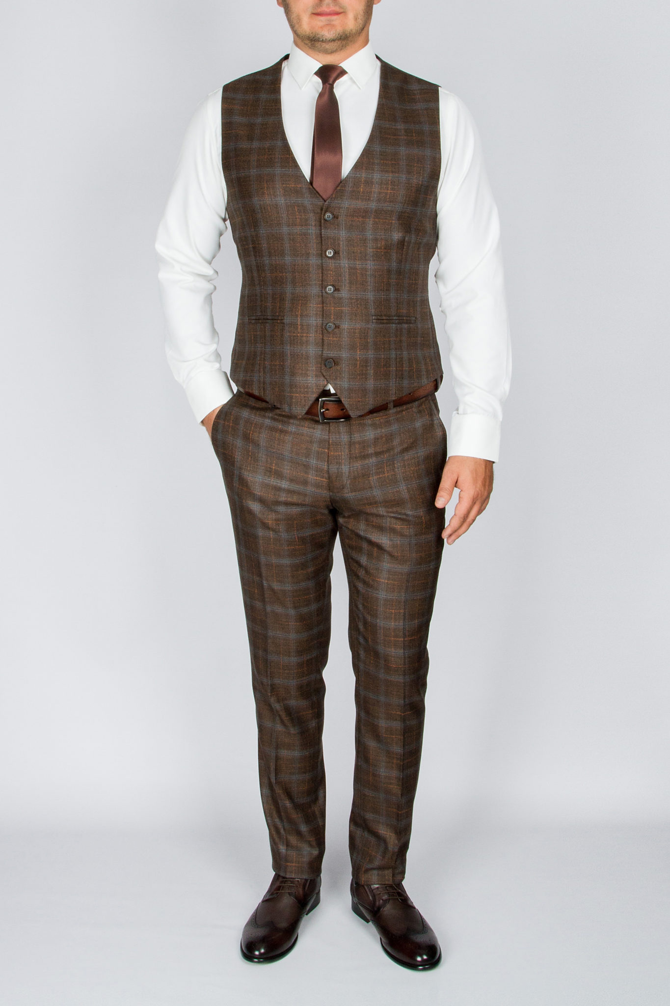 Костюм имеет замечательную посадку, отлично садится практически на любой тип фигуры. Ткань верха,-комбинация оранжевой и серой клетки на коричневой основе. Выглядит свежо и оригинально. Жилет костюма по спине также тканевый, что позволяет использовать его отдельно только с брюками.