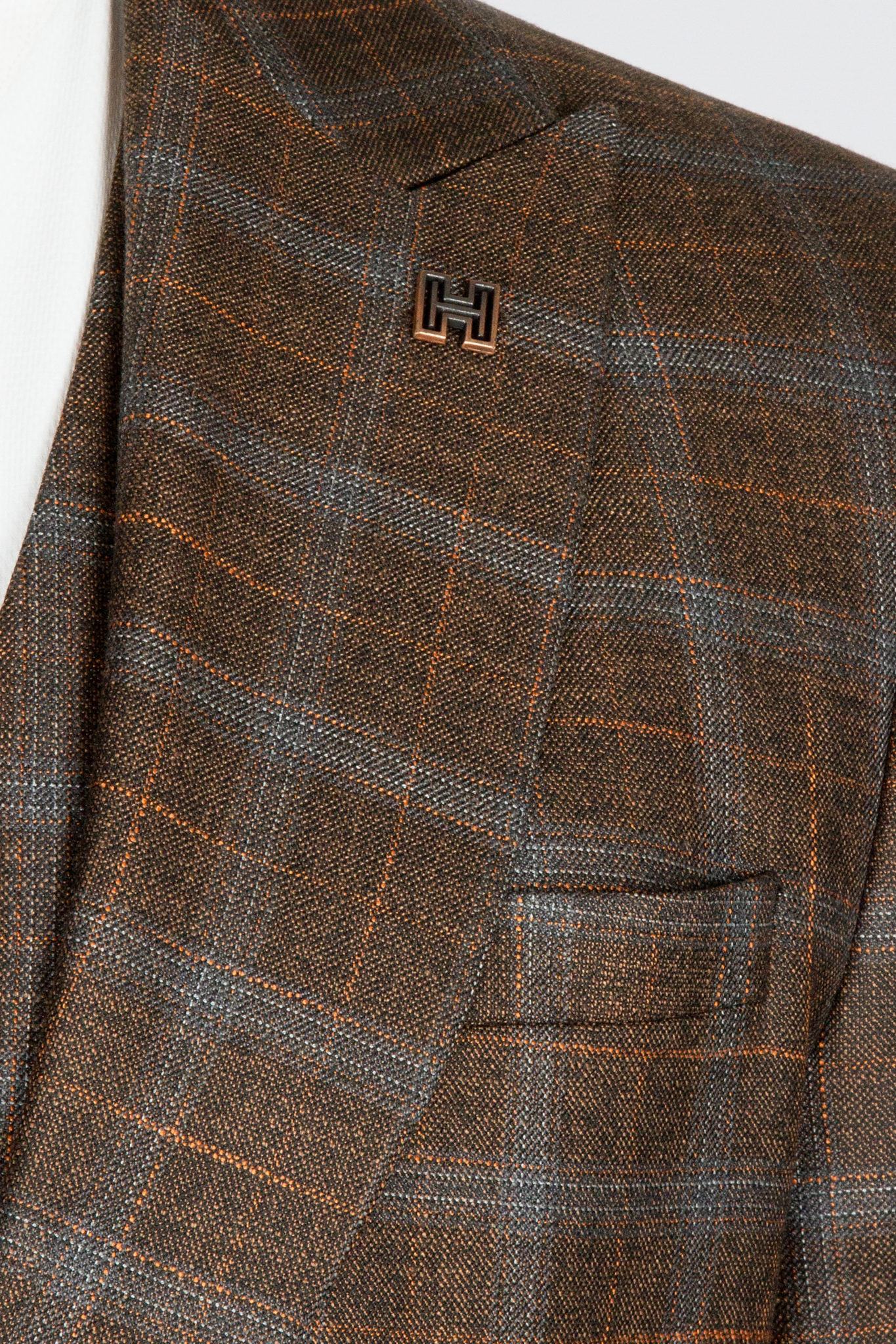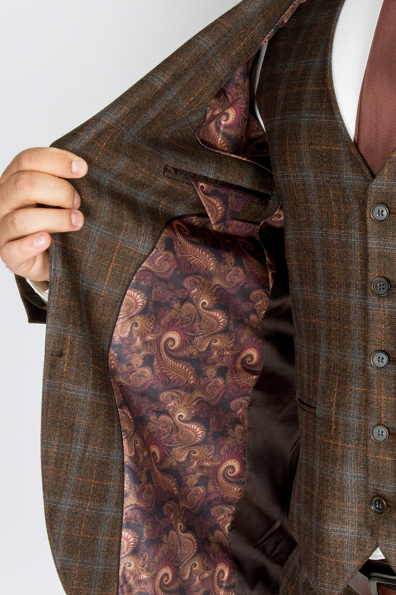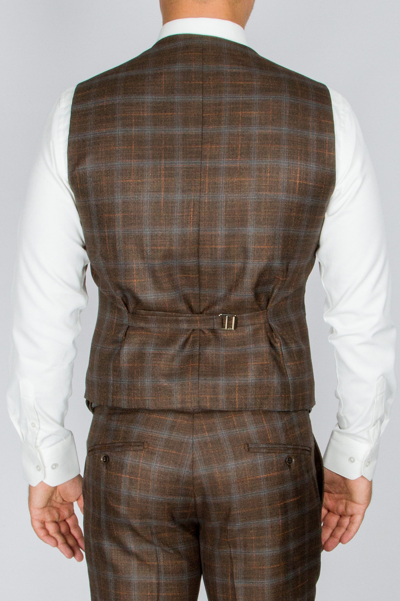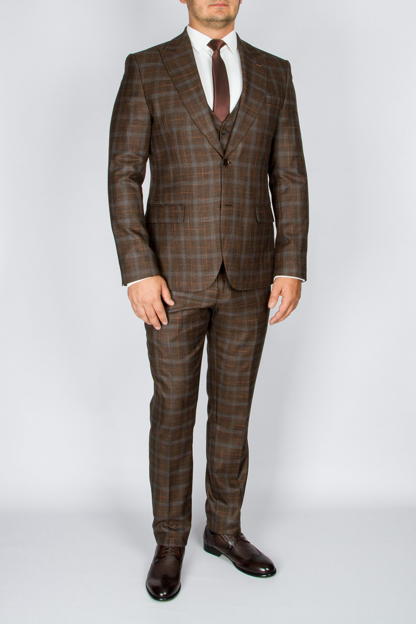 Костюм имеет замечательную посадку, отлично садится практически на любой тип фигуры. Ткань верха,-комбинация оранжевой и серой клетки на коричневой основе. Выглядит свежо и оригинально. Жилет костюма по спине также тканевый, что позволяет использовать его отдельно только с брюками.