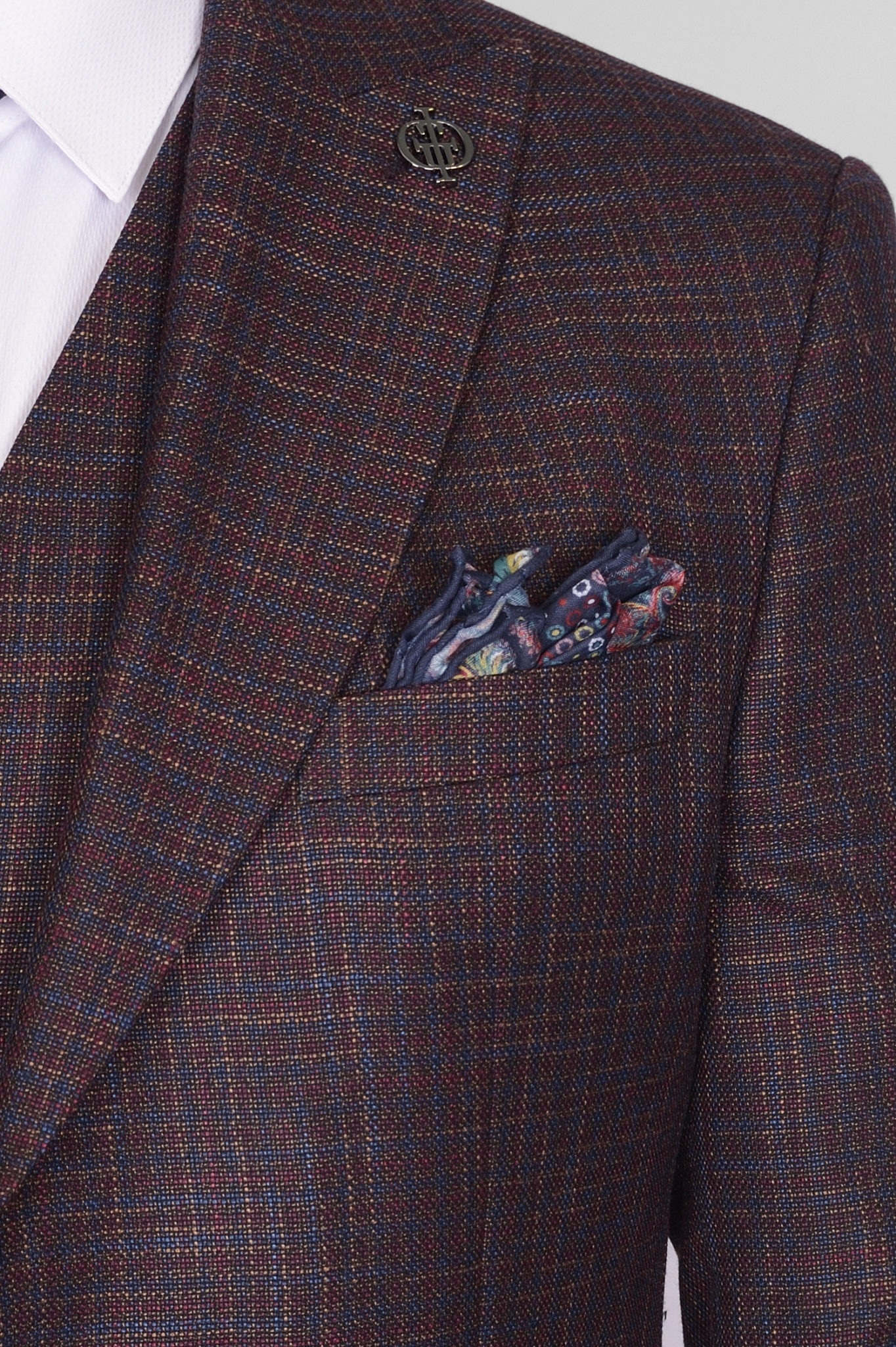 Костюм имеет замечательную посадку, отлично садится практически на любой тип фигуры. Ткань верха,-изготовлена в виде клетки с синим вкраплением на коричневой основе. Выглядит свежо и оригинально. Жилет костюма по спине также тканевый, что позволяет использовать его отдельно только с брюками.