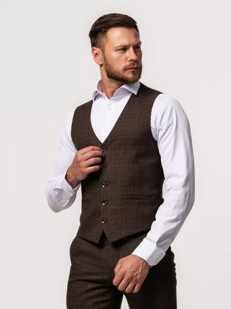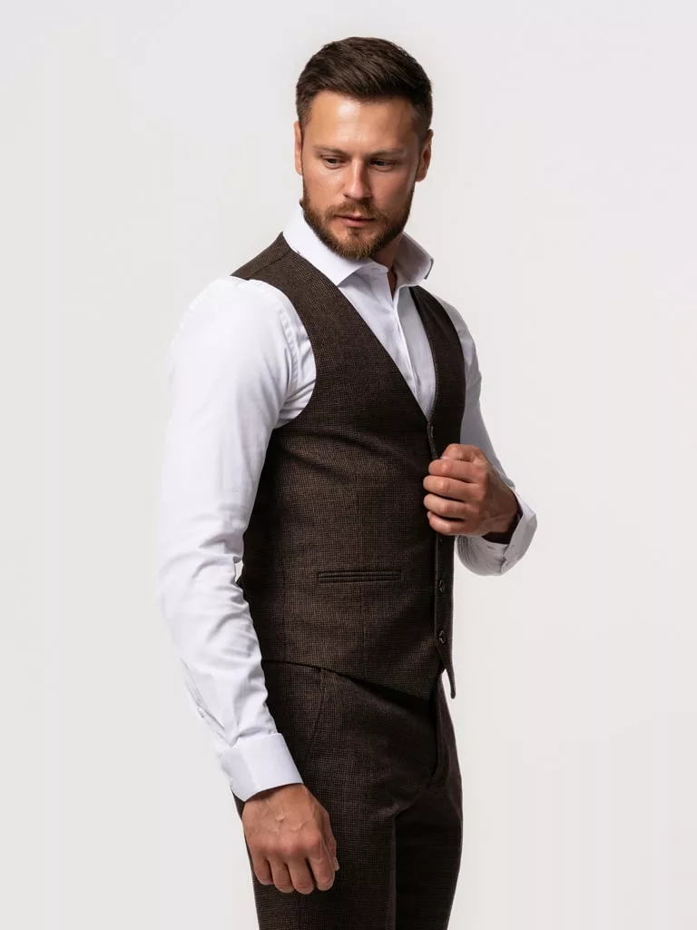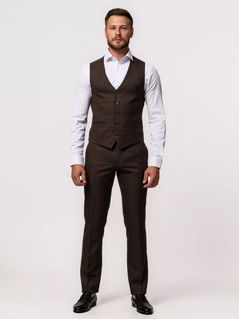 Костюм имеет замечательную посадку, отлично садится практически на любой тип фигуры.Выглядит свежо и оригинально. Жилет костюма по спине также тканевый, что позволяет использовать его отдельно только с брюками.