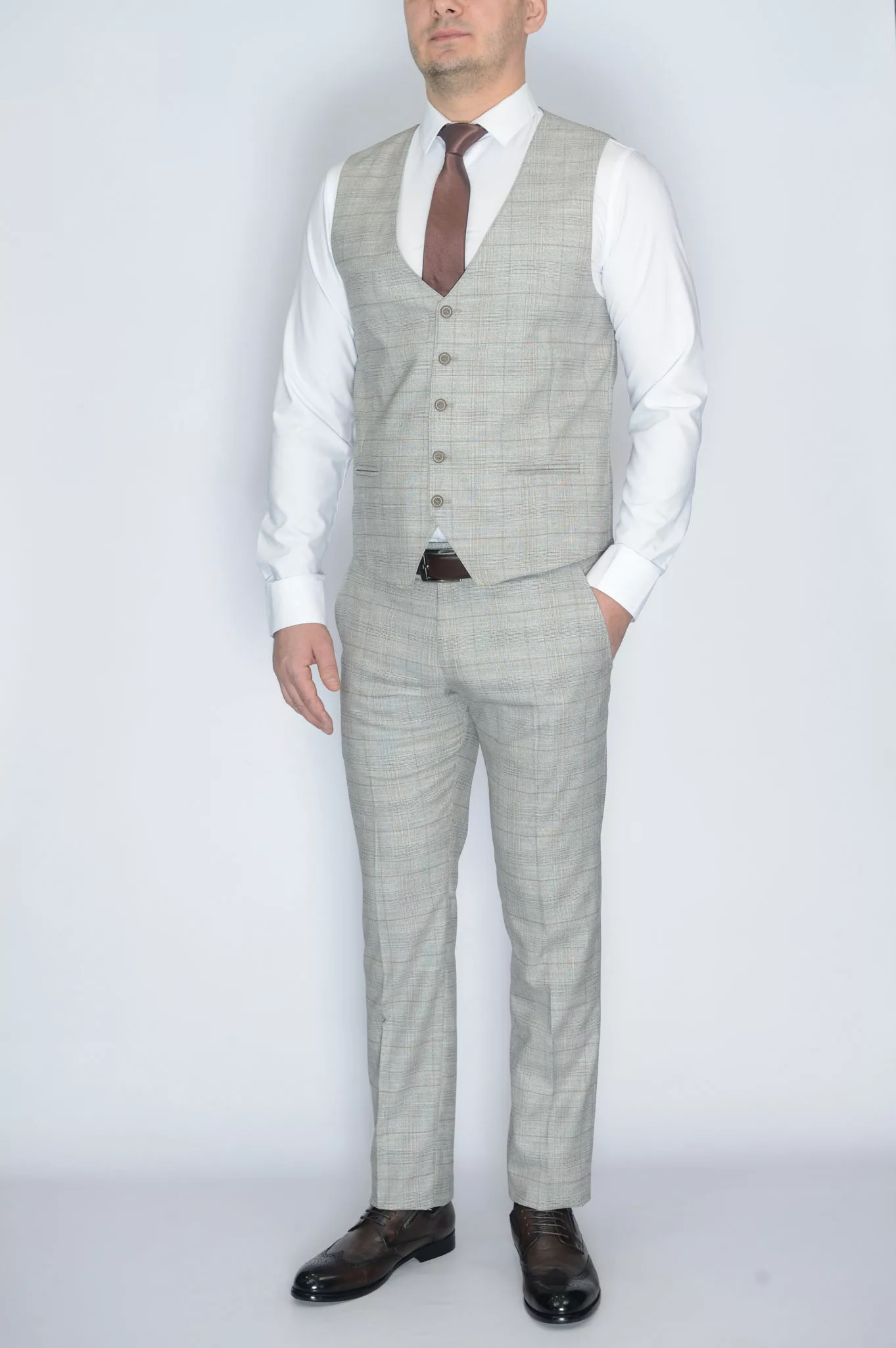 Модель отшита из высококачественной ткани в красивом светло-бежевом оттенке, дополненном английской клеткой, идеальный вариант для летней свадьбы и выпускного вечера .   Жилет костюма по спине также тканевый, что позволяет использовать его отдельно  с брюками,  будет отлично выглядеть без пиджака.