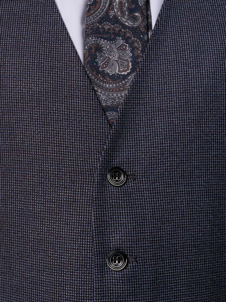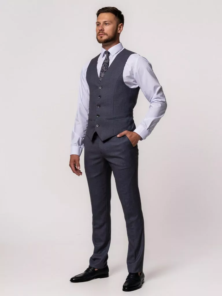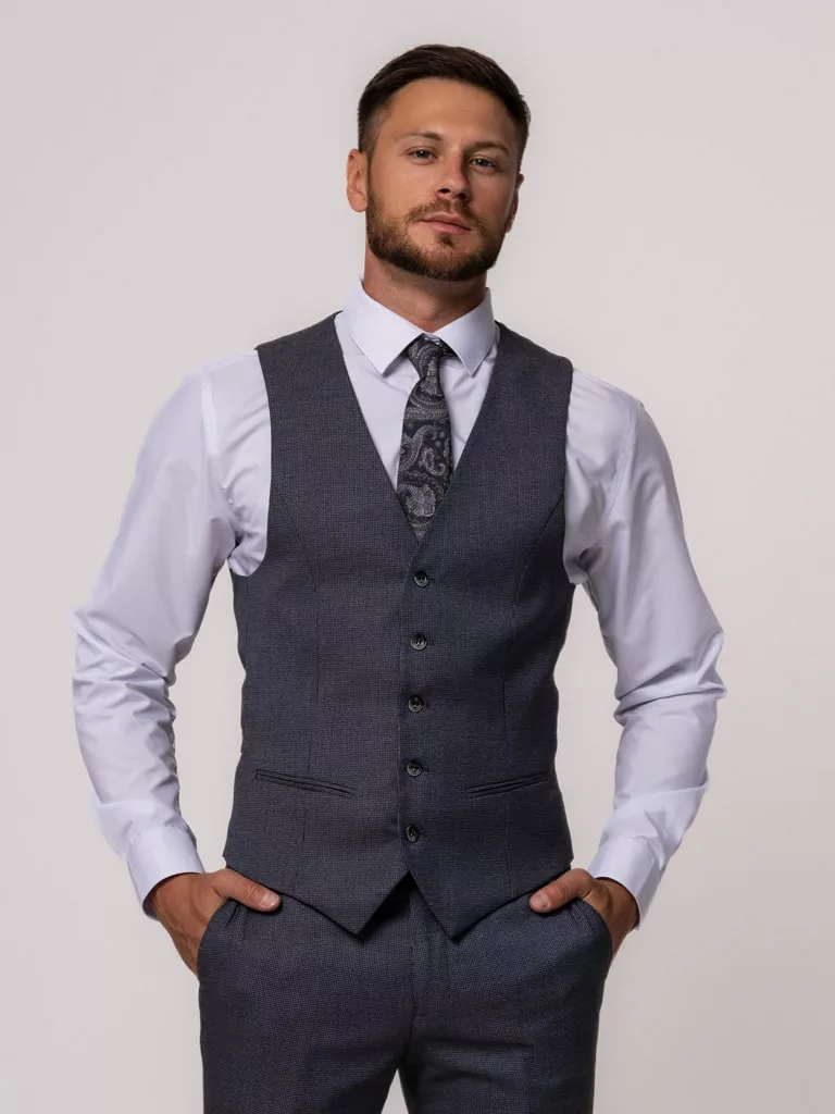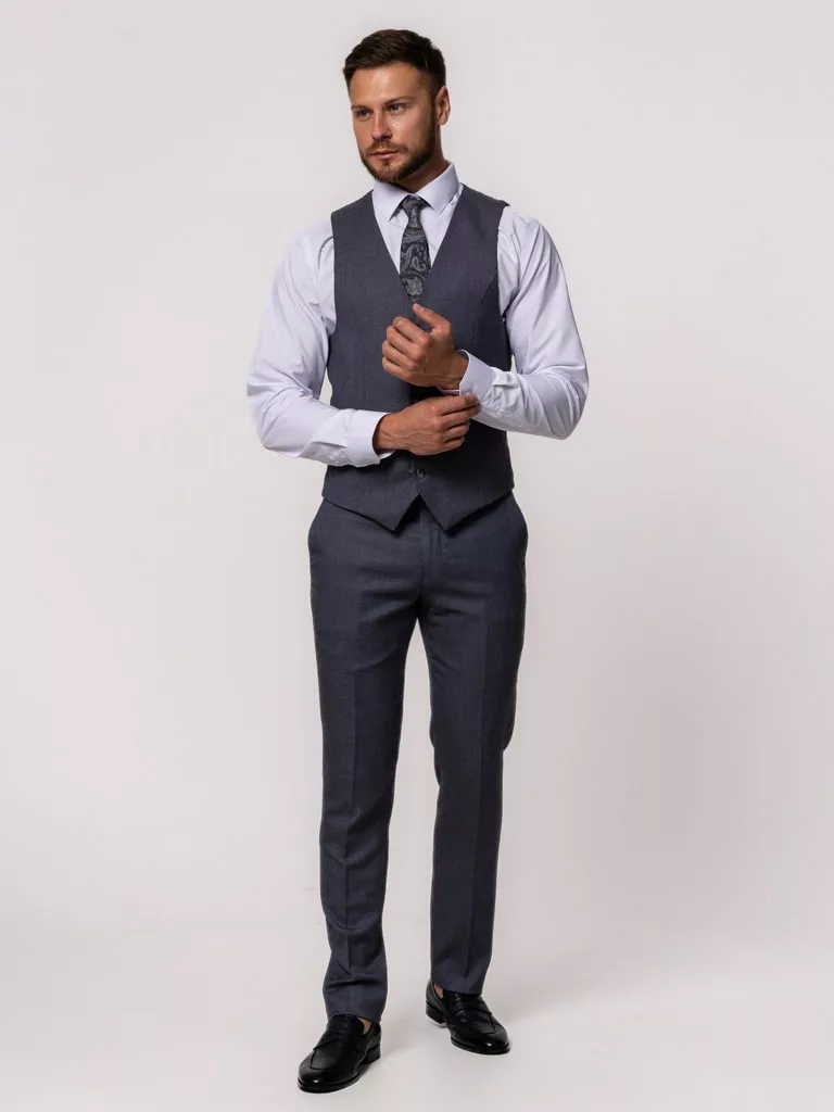 Костюм имеет замечательную посадку, отлично садится практически на любой тип фигуры. Данная модель отшита в светло-сером цвете, ткань имеет структурный рисунок, отлично подойдет для офиса и повседневной носки.  Жилет костюма по спине также тканевый, что позволяет использовать его отдельно только с брюками.