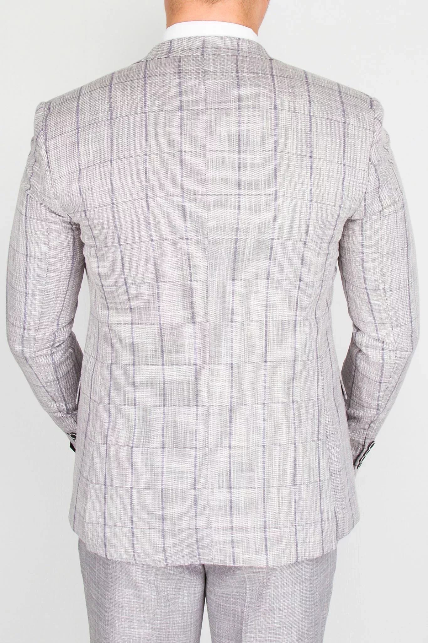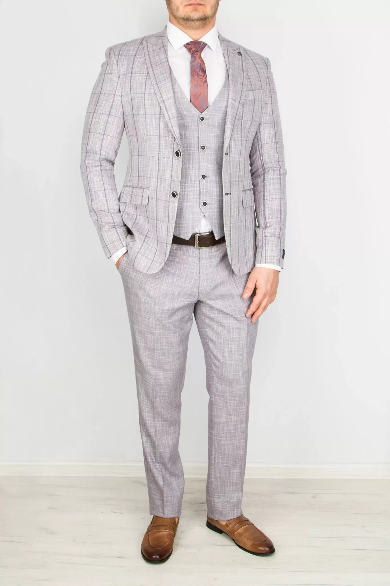 Костюм-тройка светло-серого цвета с клеточным пиджаком