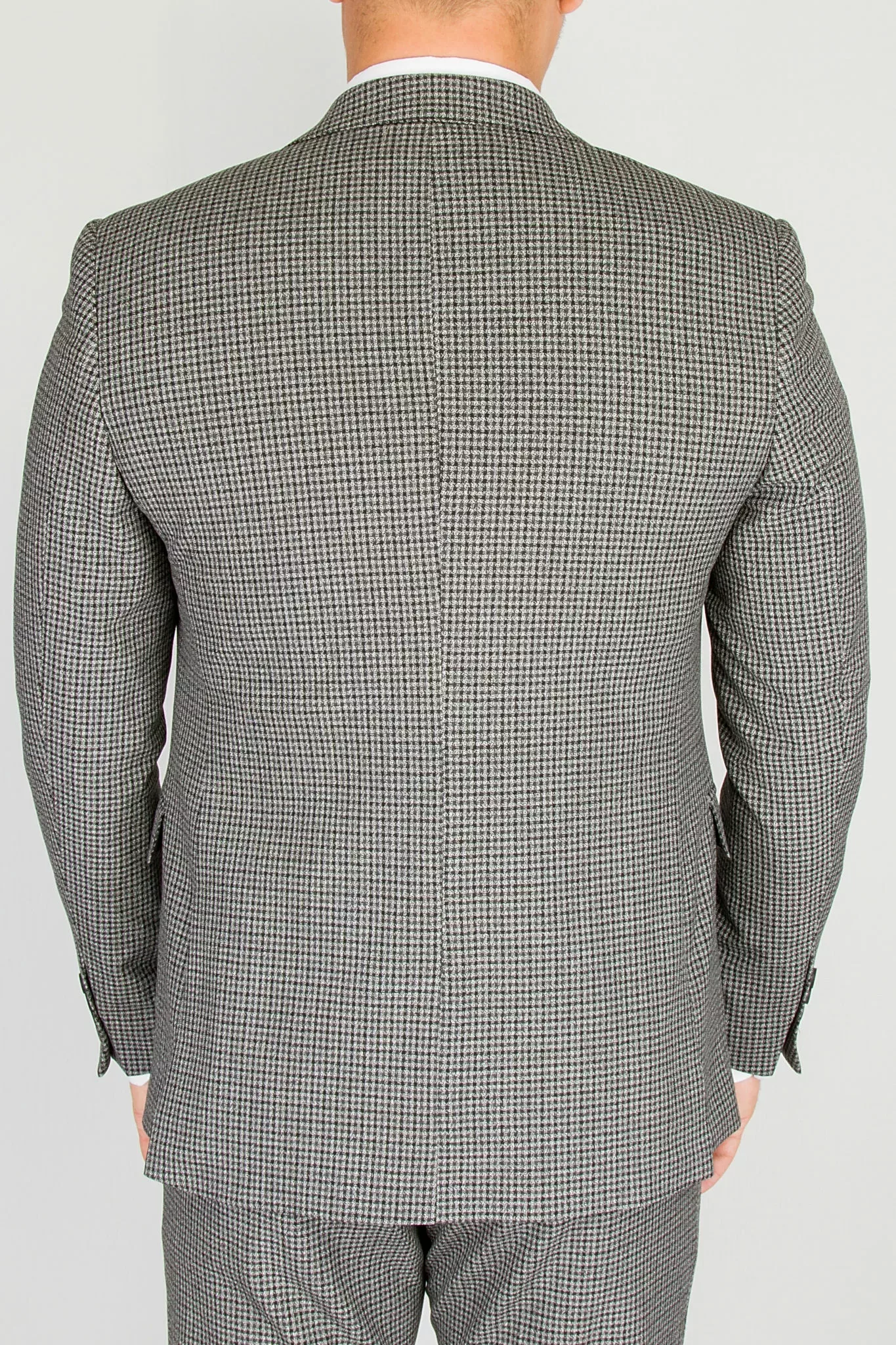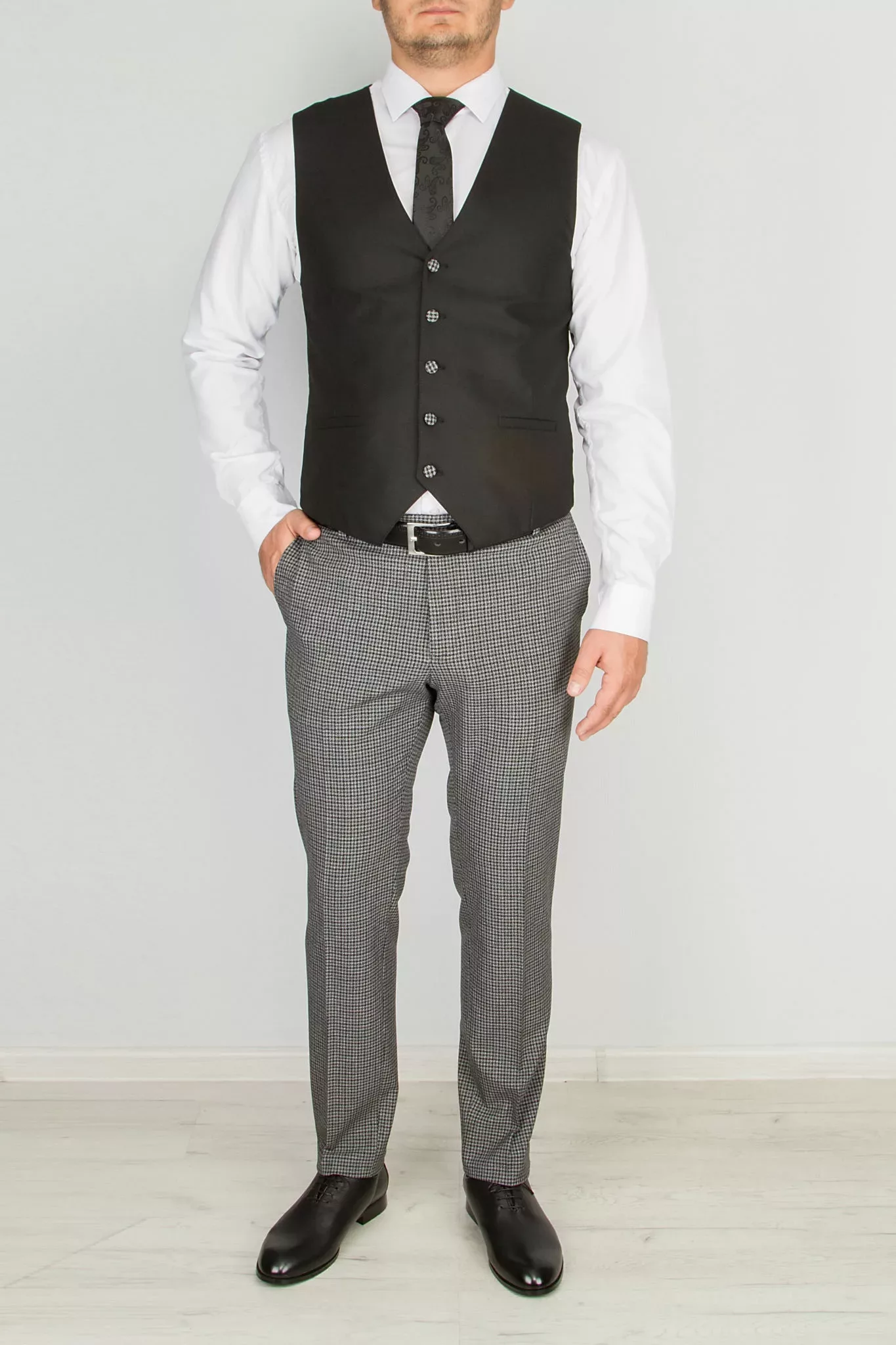 Костюм-тройка серого цвета в клетку с черным жилетом