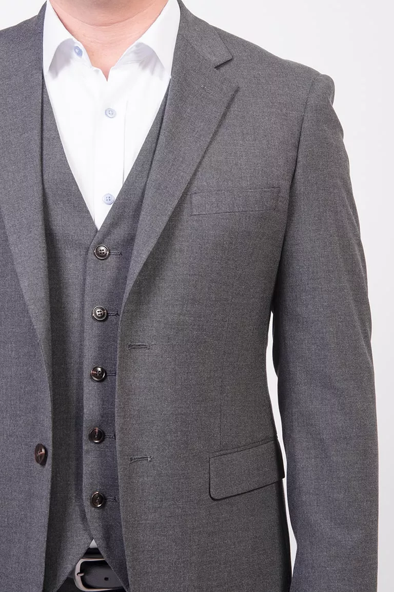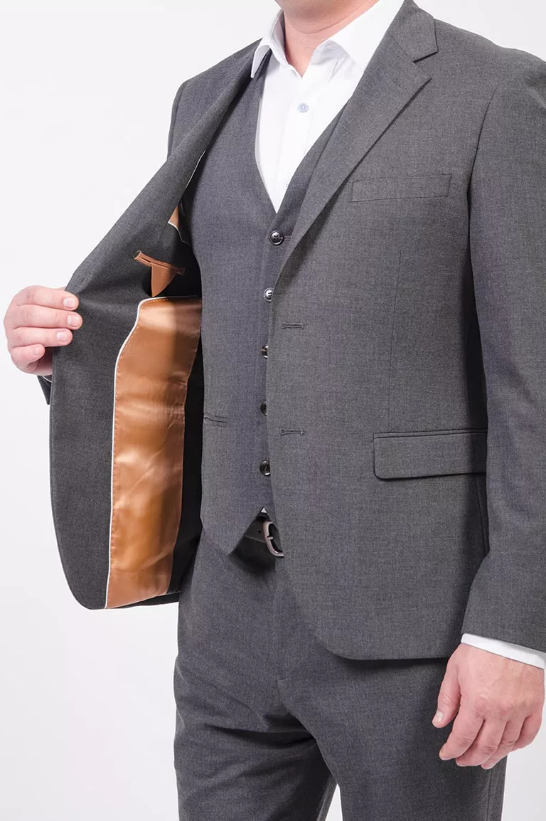 Костюм отшит в современной полуприталенной модели . Пиджак имеет застежку на две пуговицы, английский воротник, значок в петлице. Жилет однобортный с регулятором обьема. Брюки прямого кроя, имеют свободную длину. По вашей просьбе мы бесплатно подгоним длину брюк под вашу ростовку. Костюм отшит из смесовой ткани высокого качества в составе 65% шерсти и 30% вискозы и 5% эластан, что позволяет долго сохранять презентабельный внешний вид и форму, ткань устойчива к заминанию.
