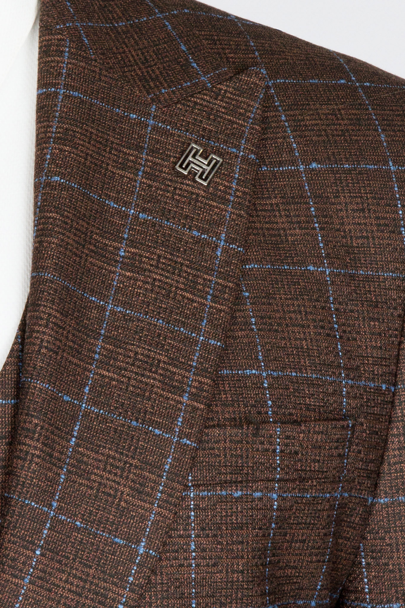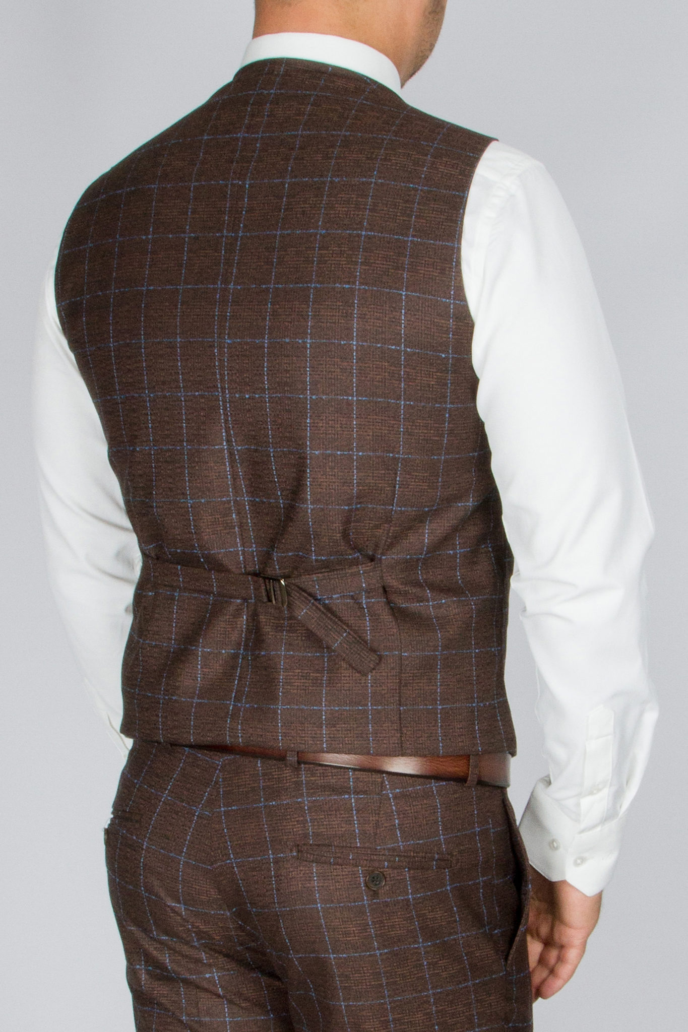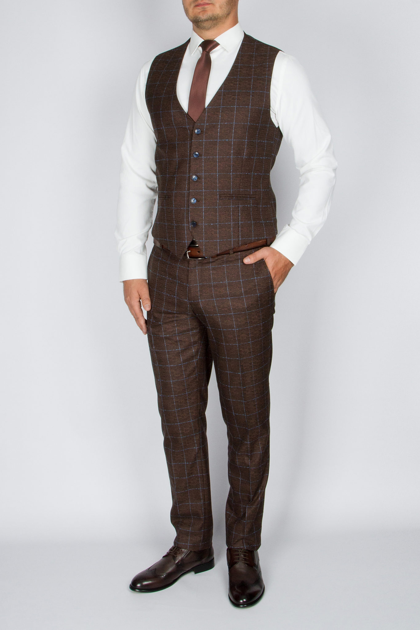 Костюм имеет замечательную посадку, отлично садится практически на любой тип фигуры. Ткань верха, оригинального, красивого шоколадного оттенка скомпанована с голубой клеткой. Жилет костюма по спине также тканевый, что позволяет использовать его отдельно только с брюками.