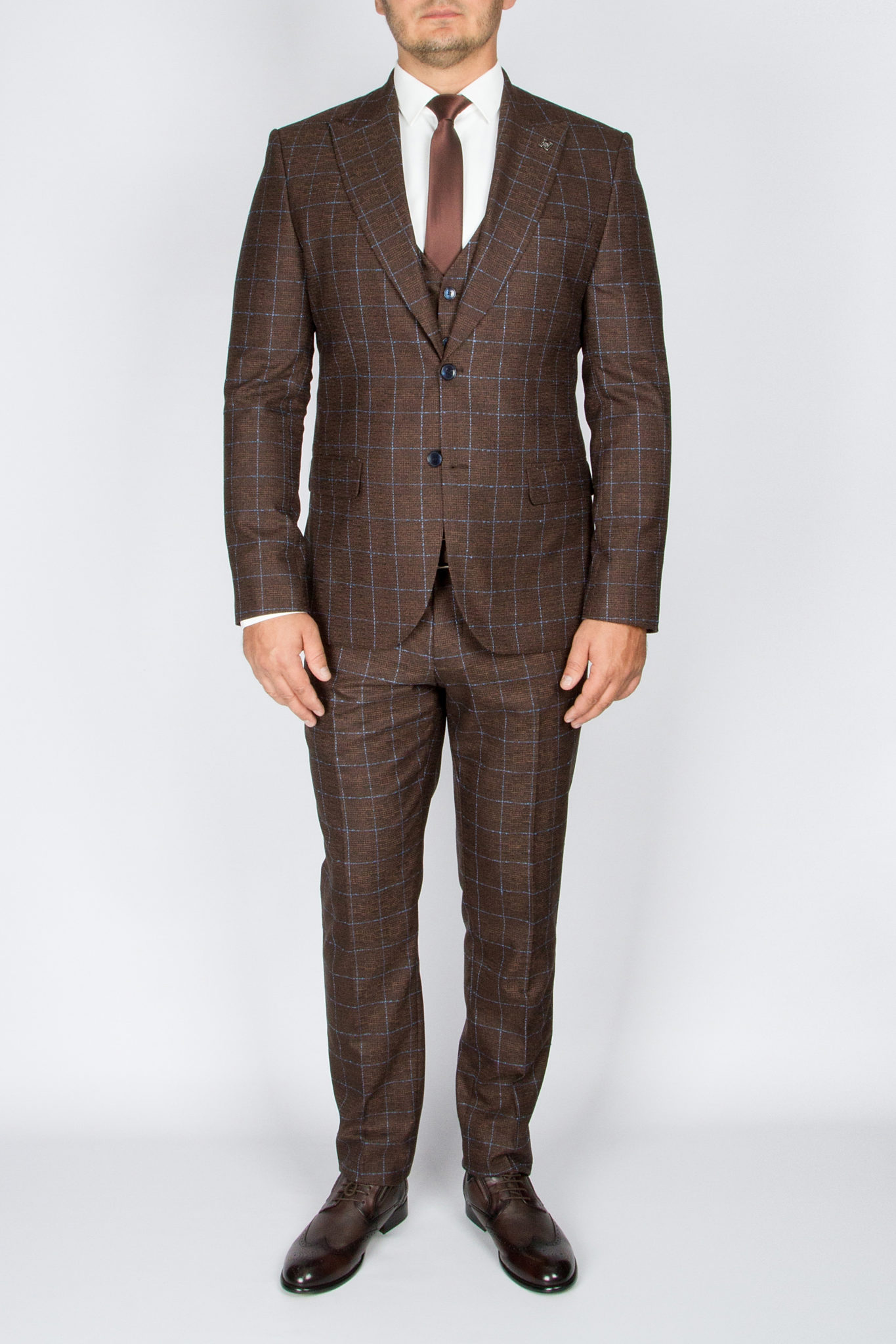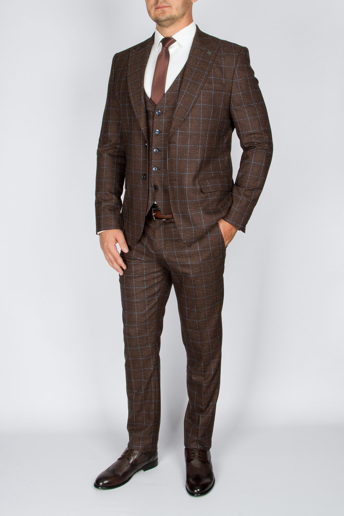 Костюм-тройка шоколадного цвета в голубую клетку