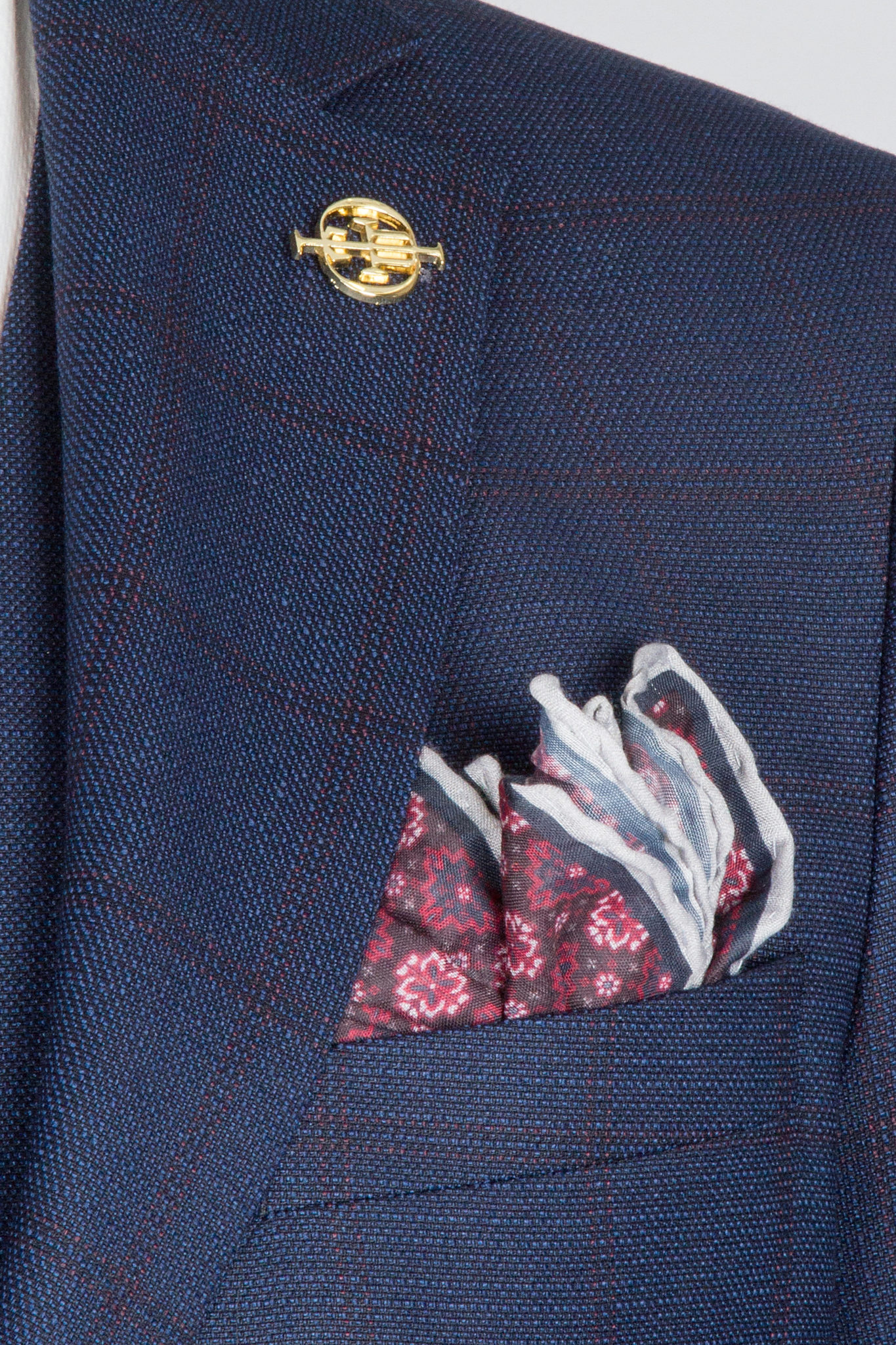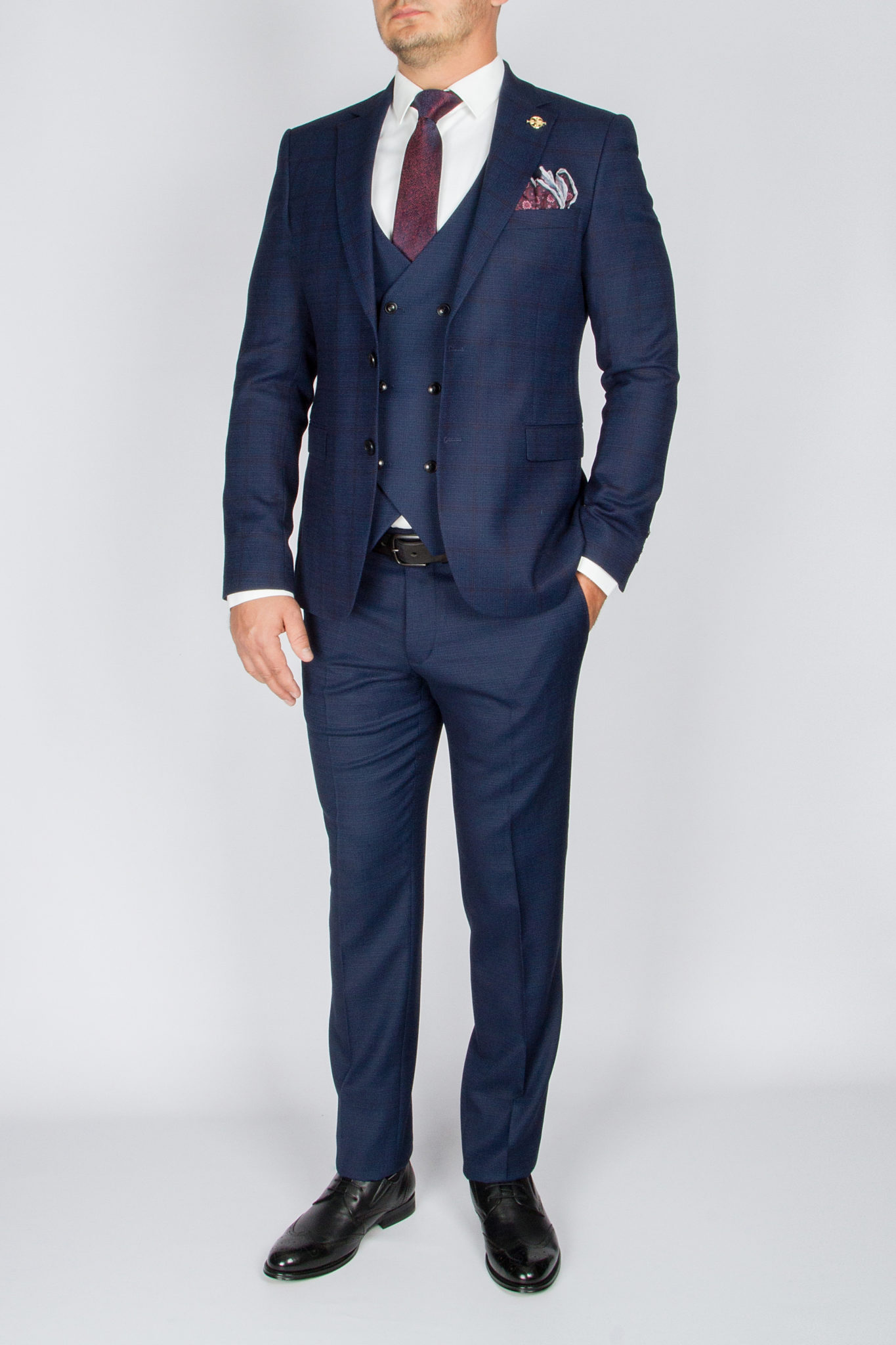 Костюм-тройка синего цвета с клеточным пиджаком