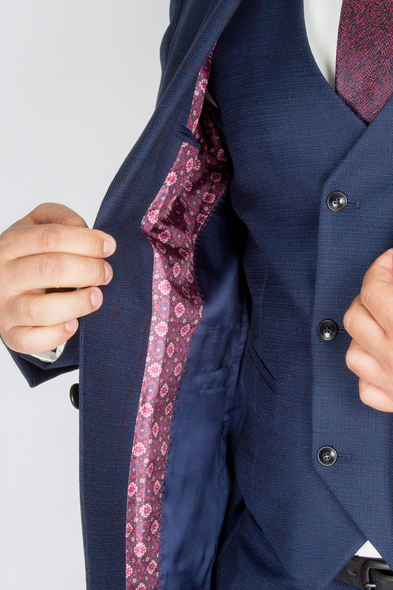 Костюм отшит в модели «компаньон»,- однотонные жилет и брюки скомпанованы с клеточным пиджаком.