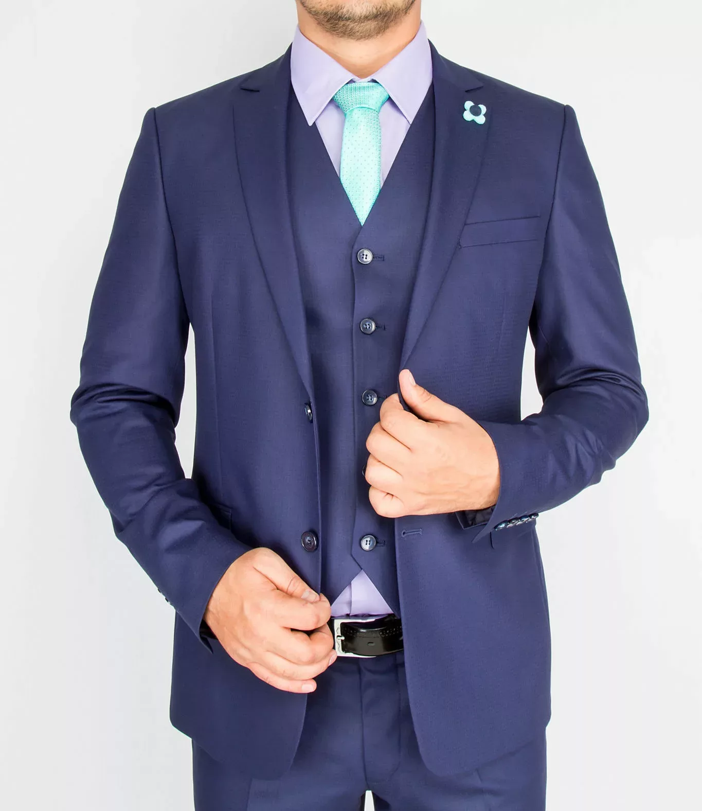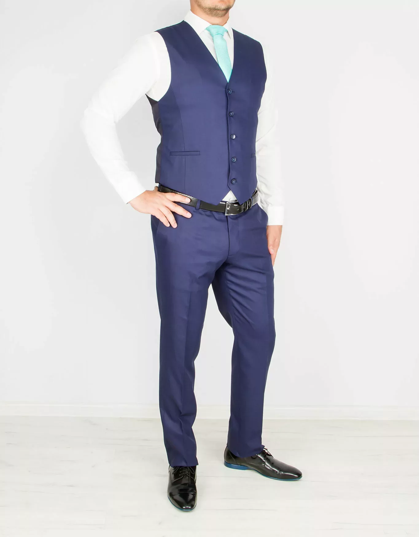 Костюм-тройка, синего цвета ткань с перфорацией