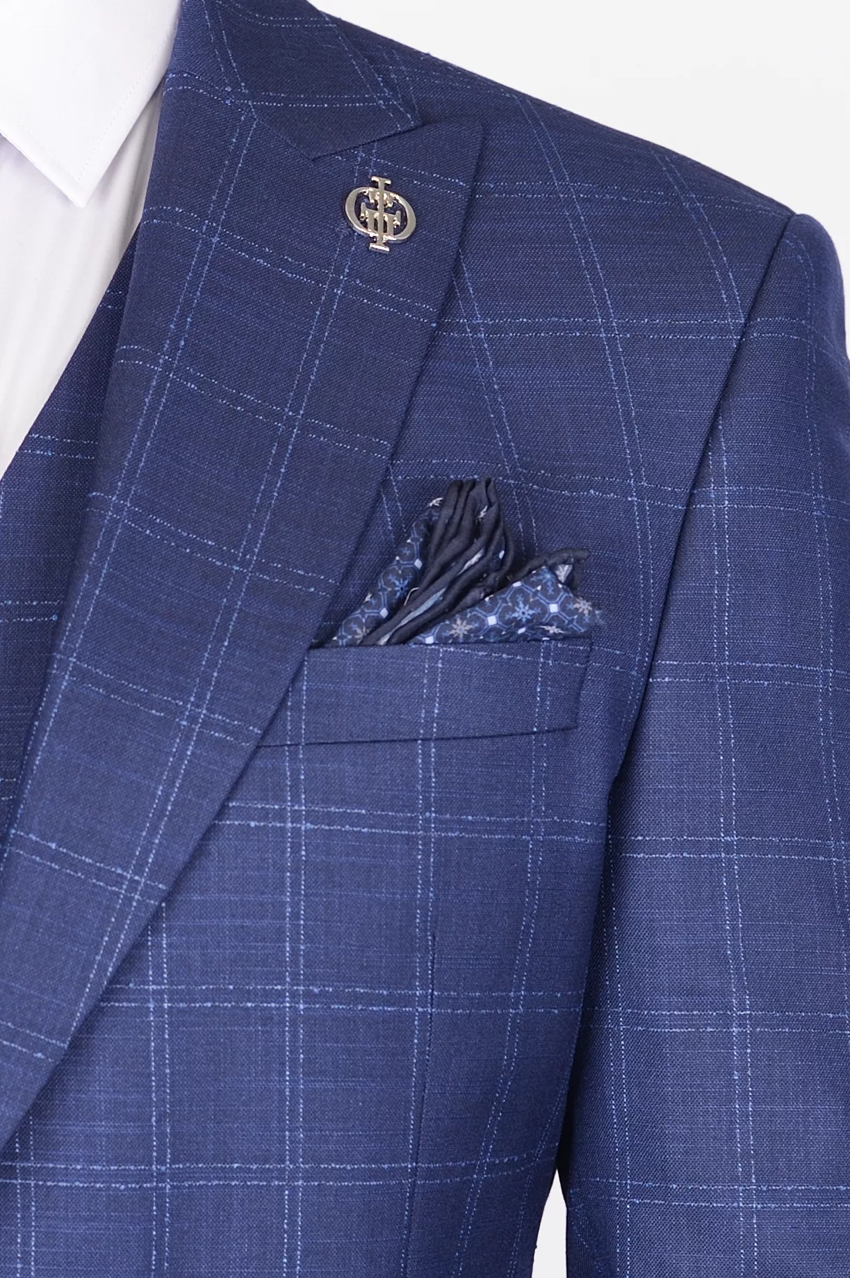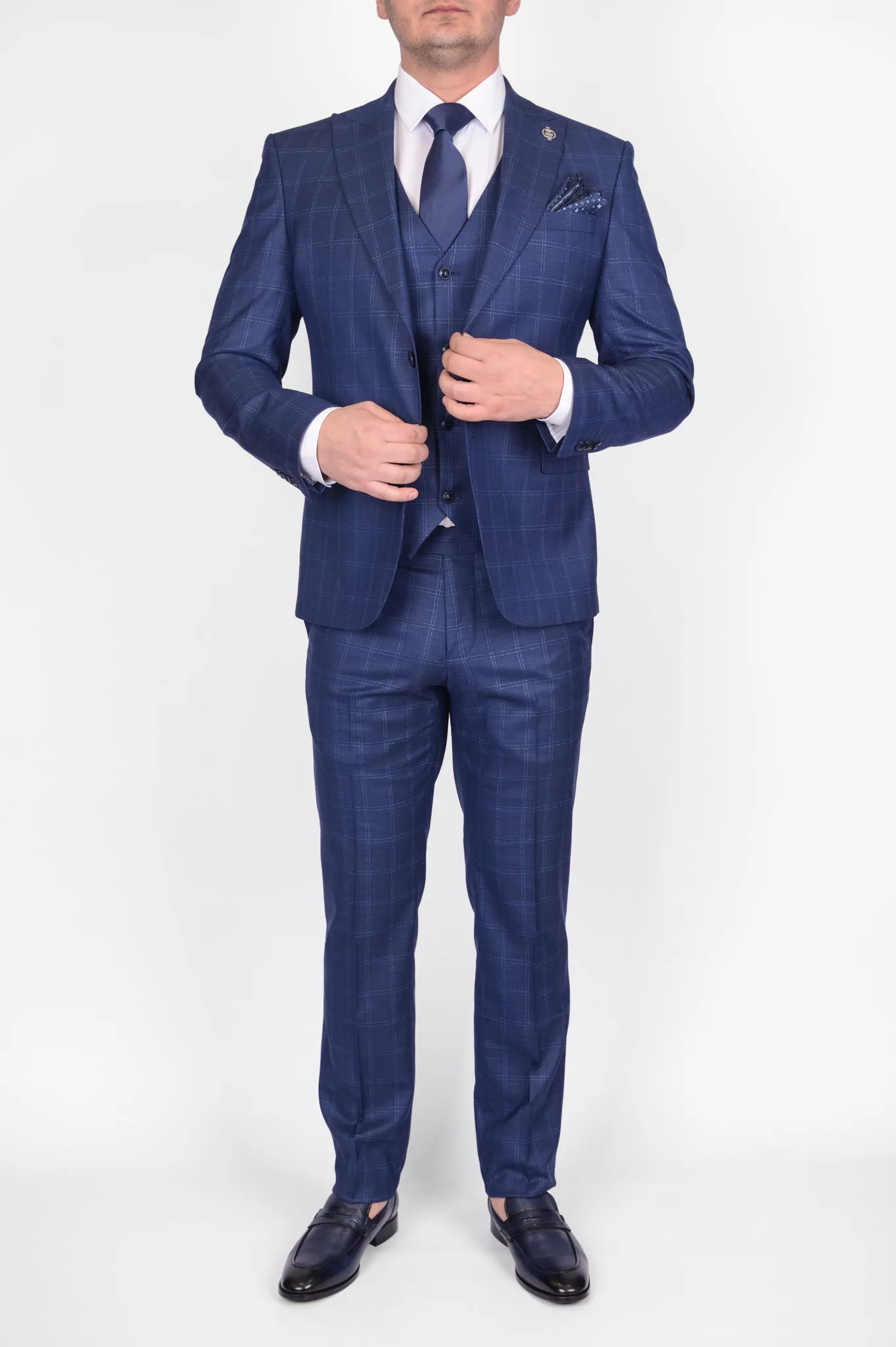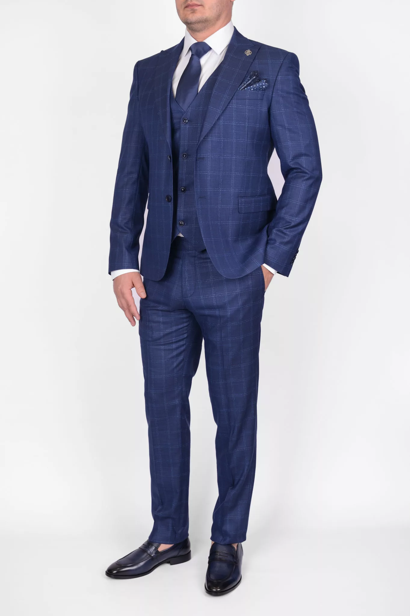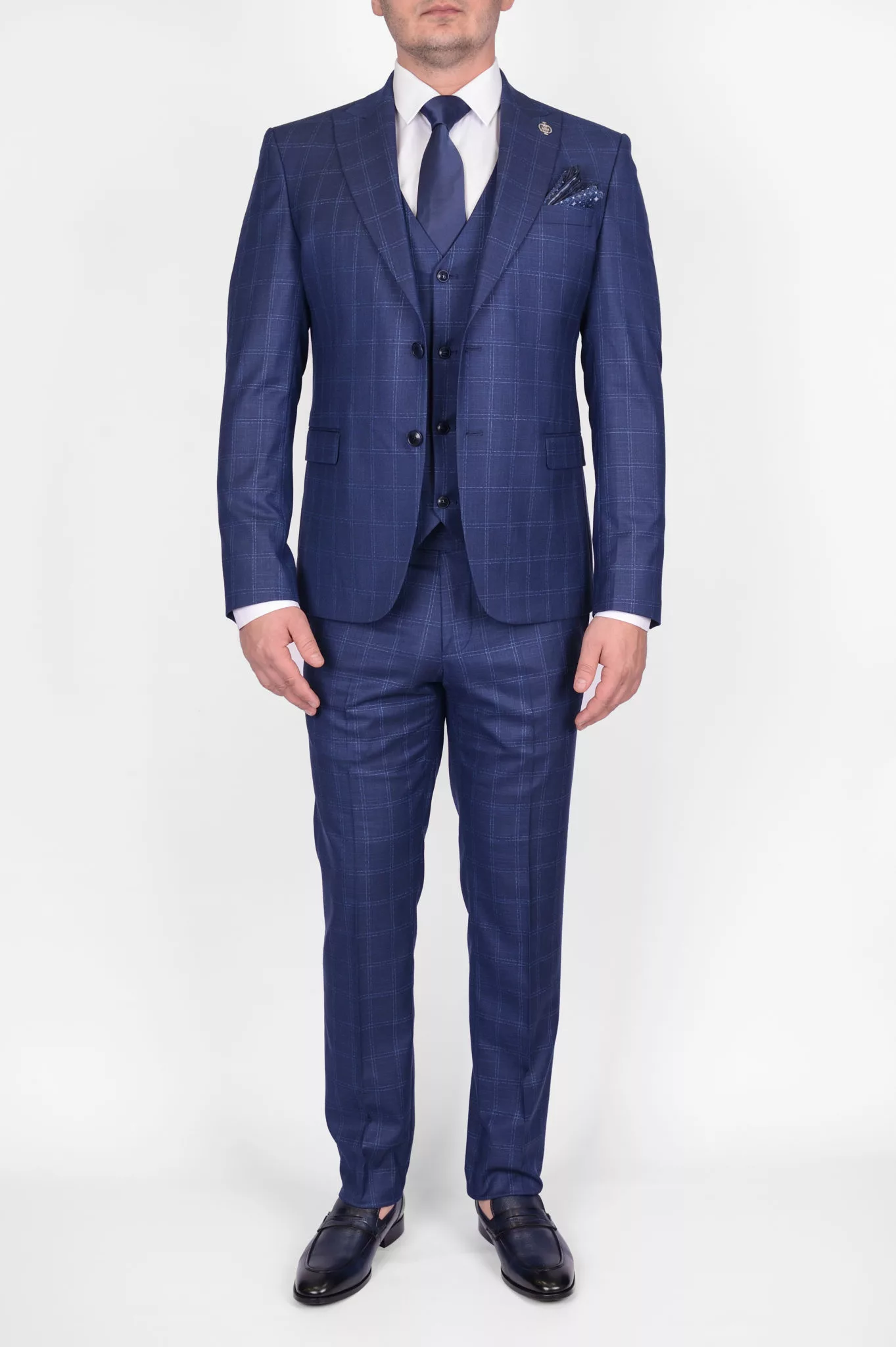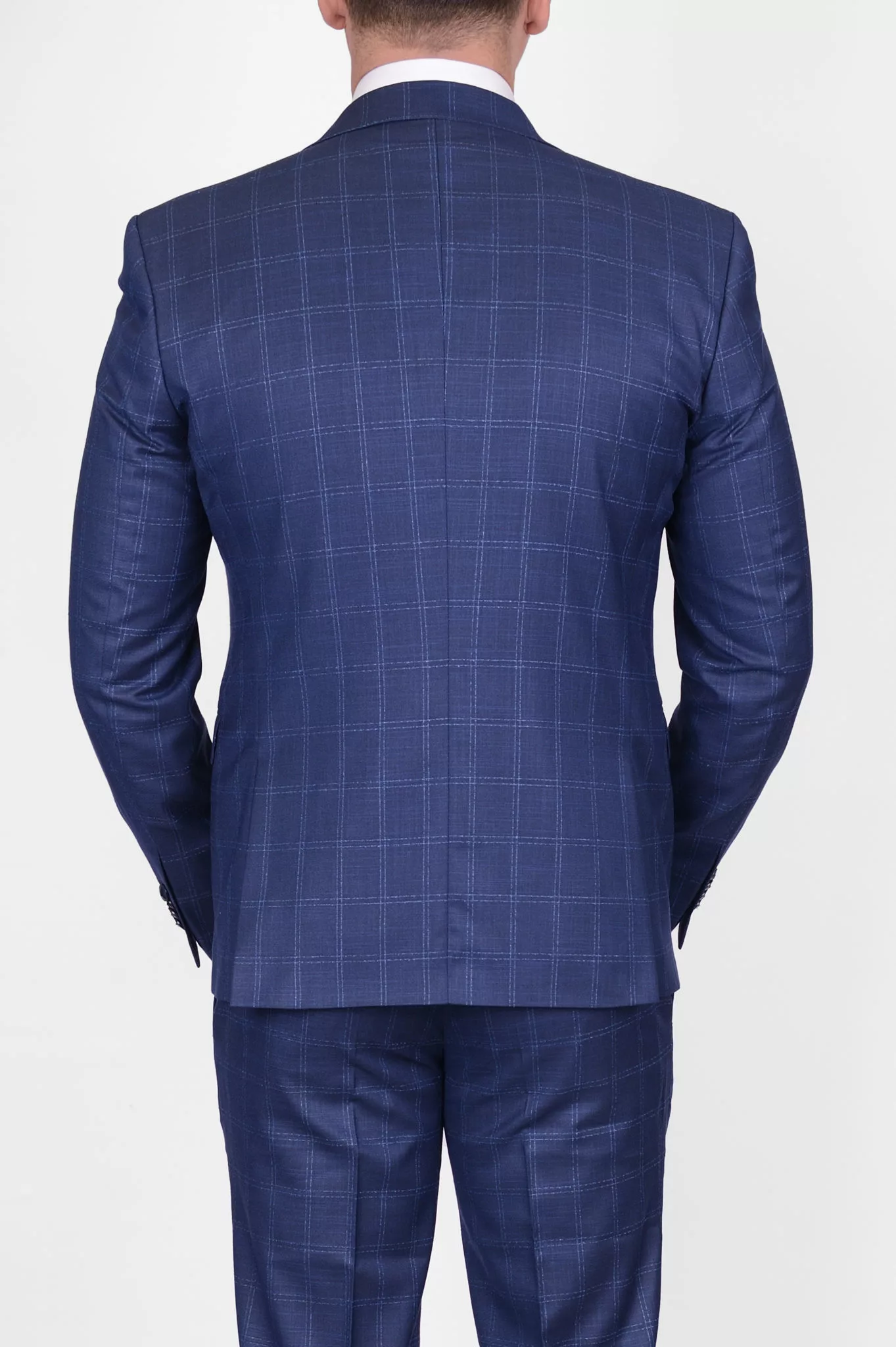 Костюм имеет замечательную посадку, отлично садится практически на любой тип фигуры. Ткань верха, насыщенного синего цвета отлично гармонирует с тонкой голубой клеткой. Жилет костюма по спине также тканевый, что позволяет использовать его отдельно только с брюками.