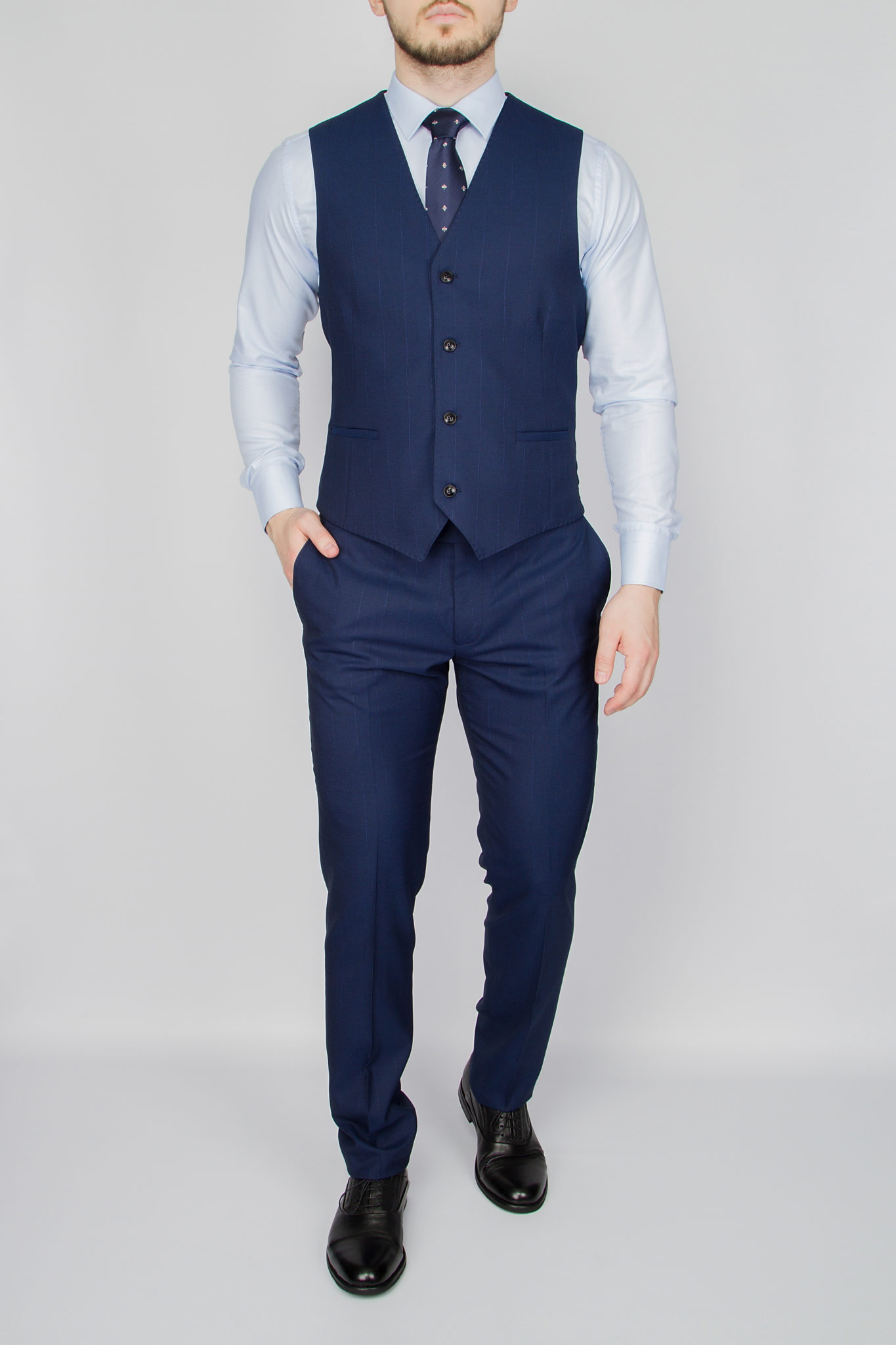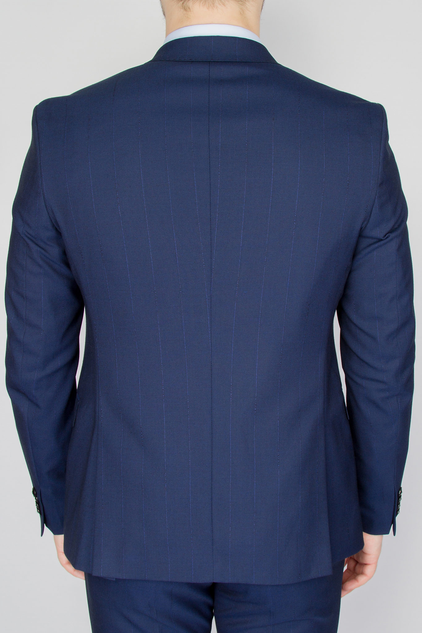 Данный костюм классического синего цвета в тонкую невыразительную полосу, выгодно отличающую его от однотонных вариаций и образов.