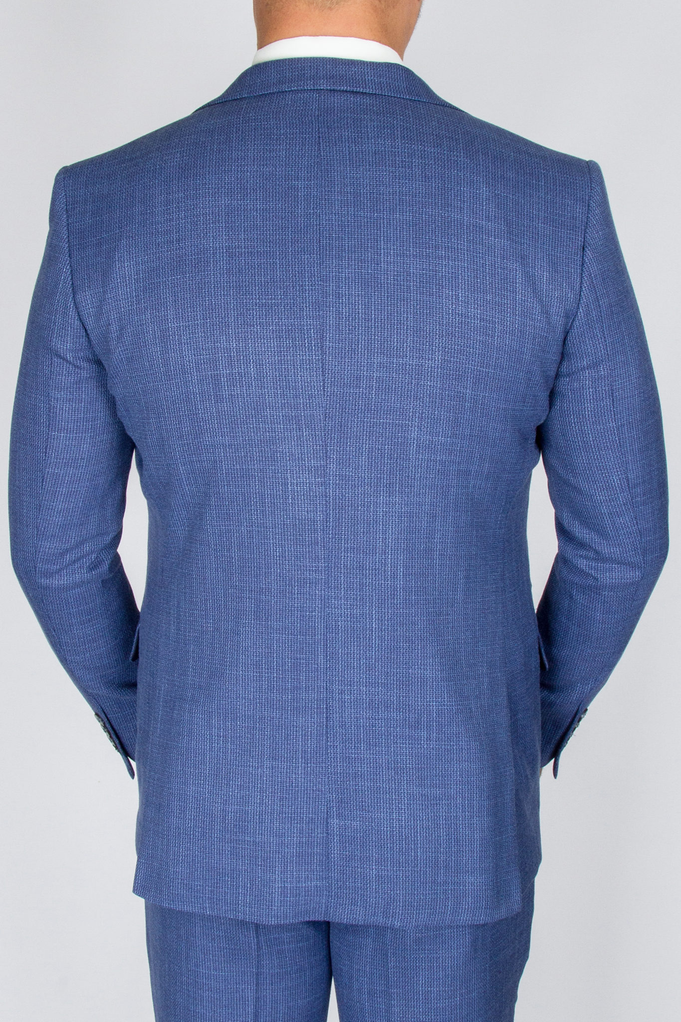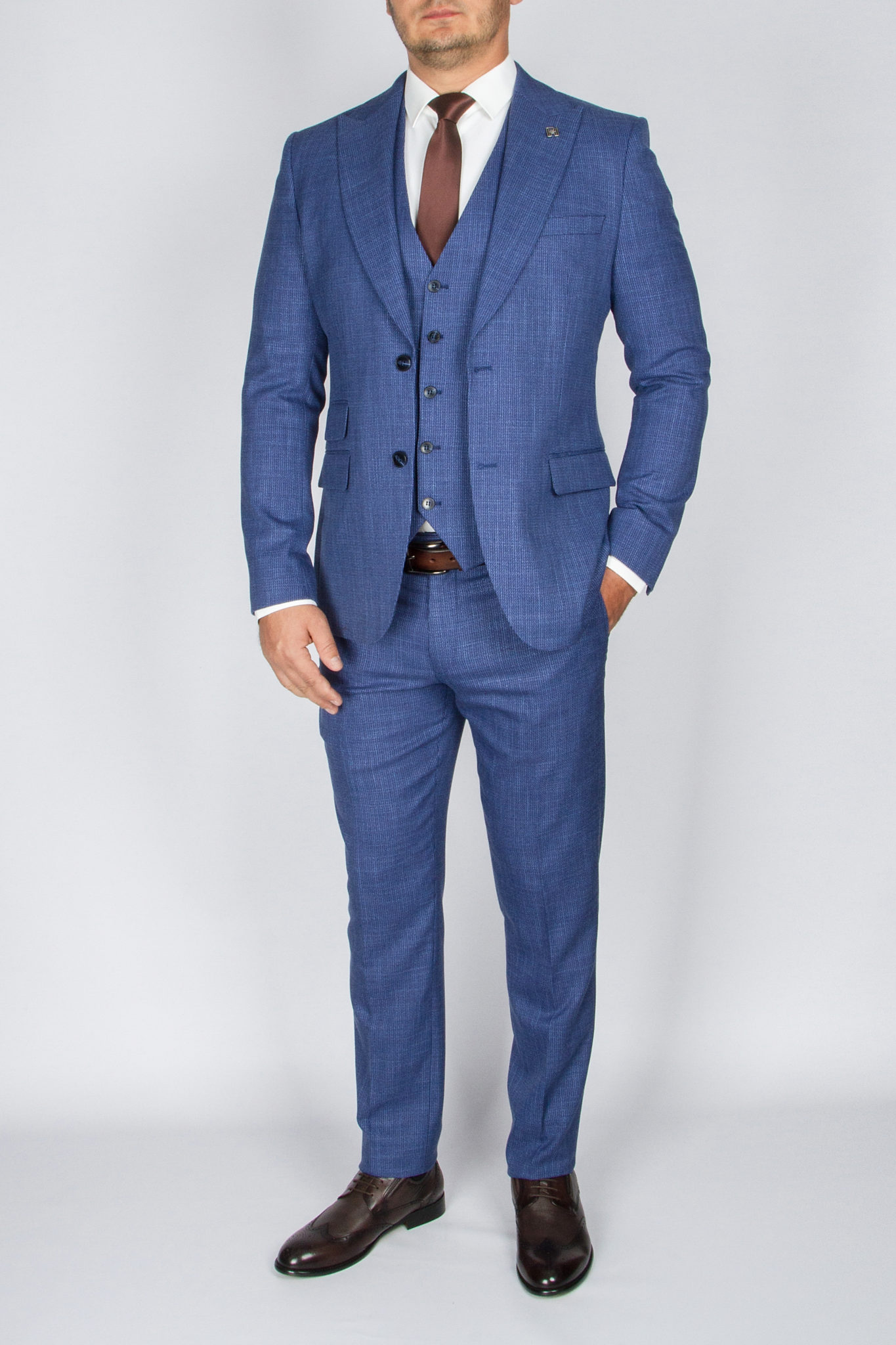 Данный костюм классического синего цвета, ткань имеет легкую выработку,  выгодно отличающую его от однотонных вариаций и образов.