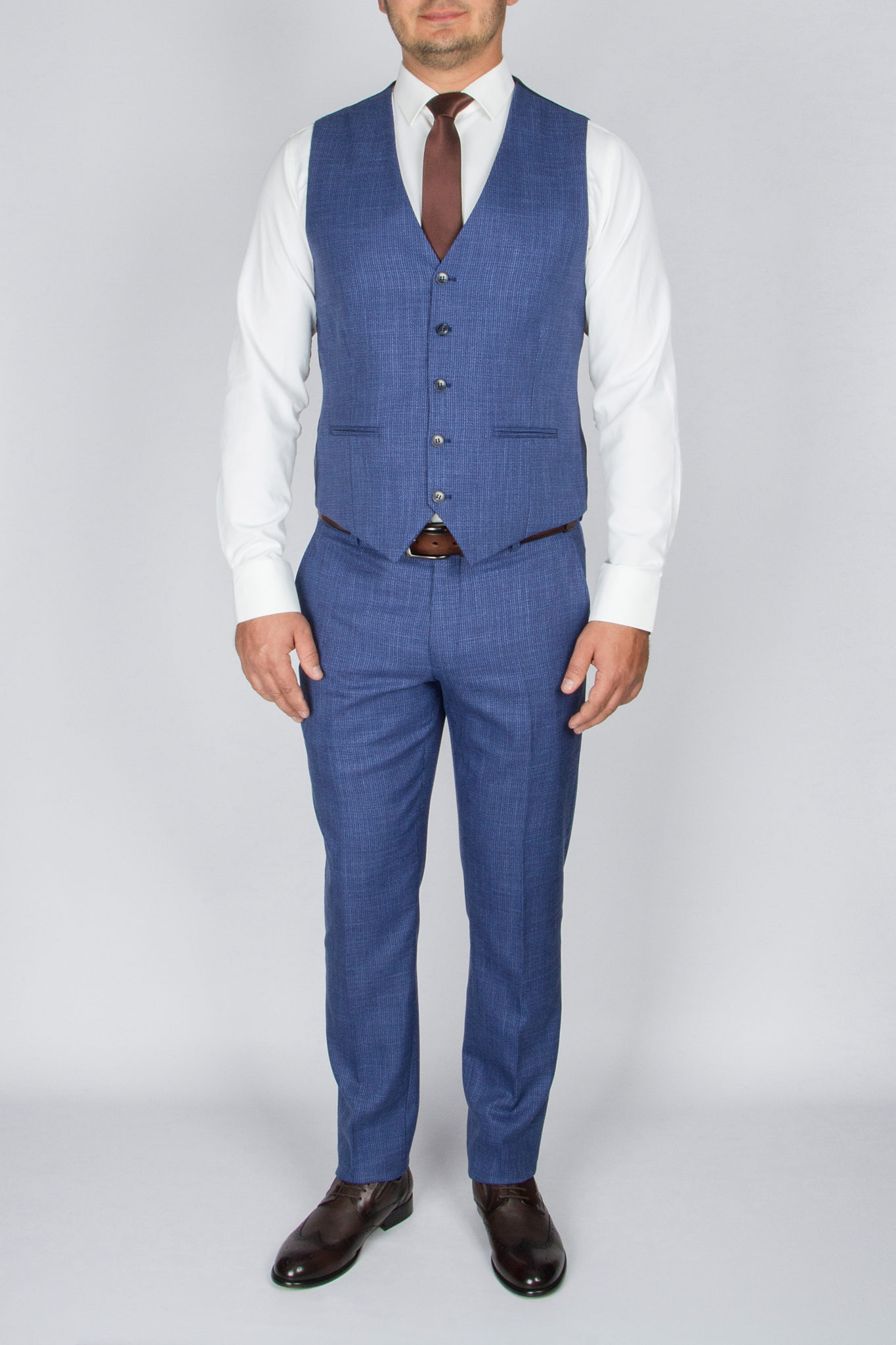 Костюм отшит в современной полуприталенной  модели regular fit. Пиджак имеет застежку на две пуговицы, заостренный лацкан воротника, значек в петлице. Жилет однобортный с регулятором обьема, по спине ткань верха (не подкладочная).  Брюки прямые без защипов, отшиты в классическом стиле приуженого кроя. По вашей просьбе мы подгоним длину брюк под вашу ростовку, заузим по ширине. Костюм отшит из смесовой ткани высокого качества в составе 80% шерсти и 20% вискозы, что позволяет долго сохранять презентабельный внешний вид и форму, ткань устойчива к заминанию.