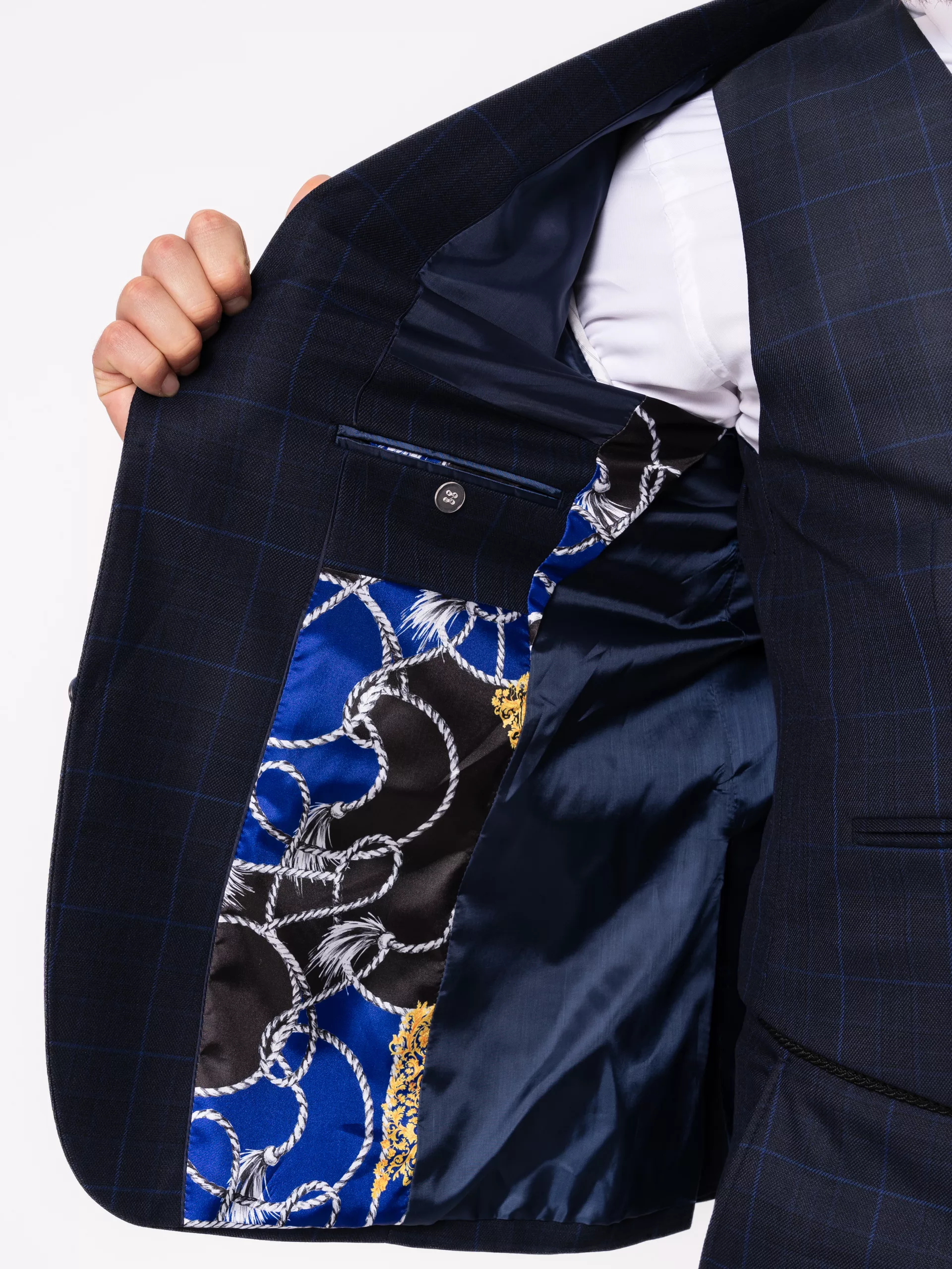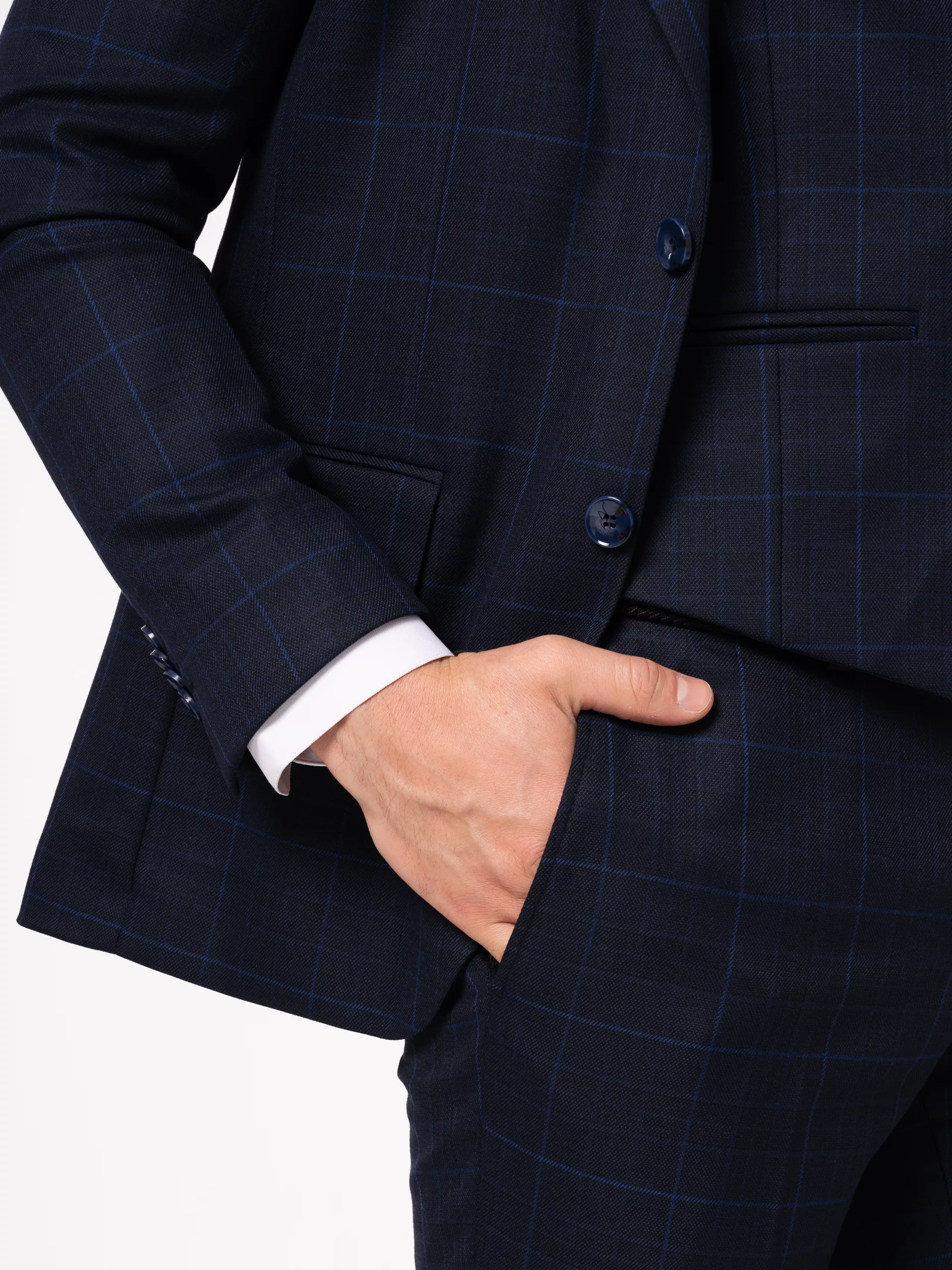 Данный костюм  темно-синего цвета дополнен неброской голубой клеткой. Подходящий вариант для офиса, учебных заведений также подойдет в качестве костюма для повседневной носки.