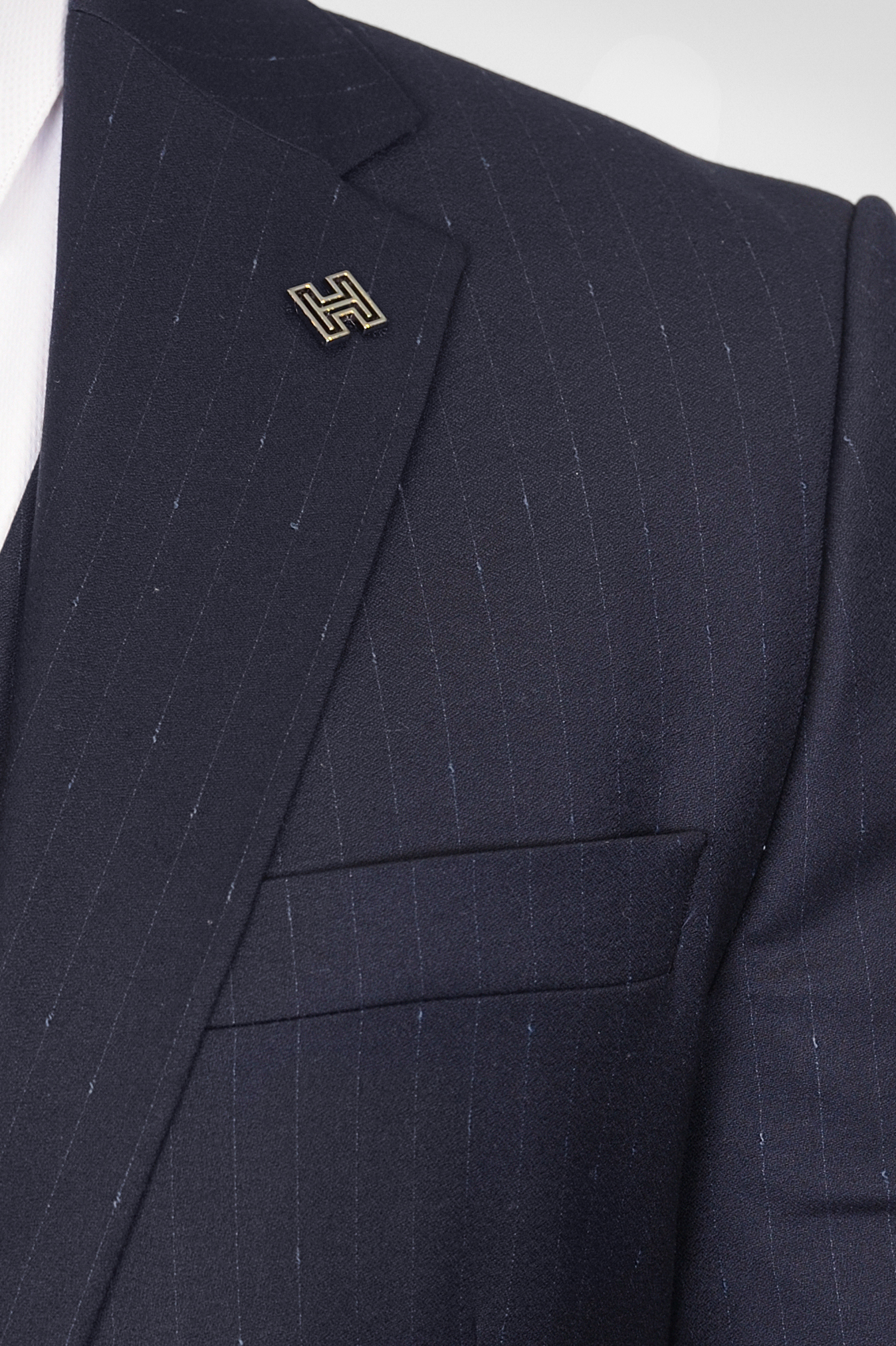 Данный костюм темно-синего цвета в невыразительную полоску, выгодно отличающую его от однотонных вариаций и образов.