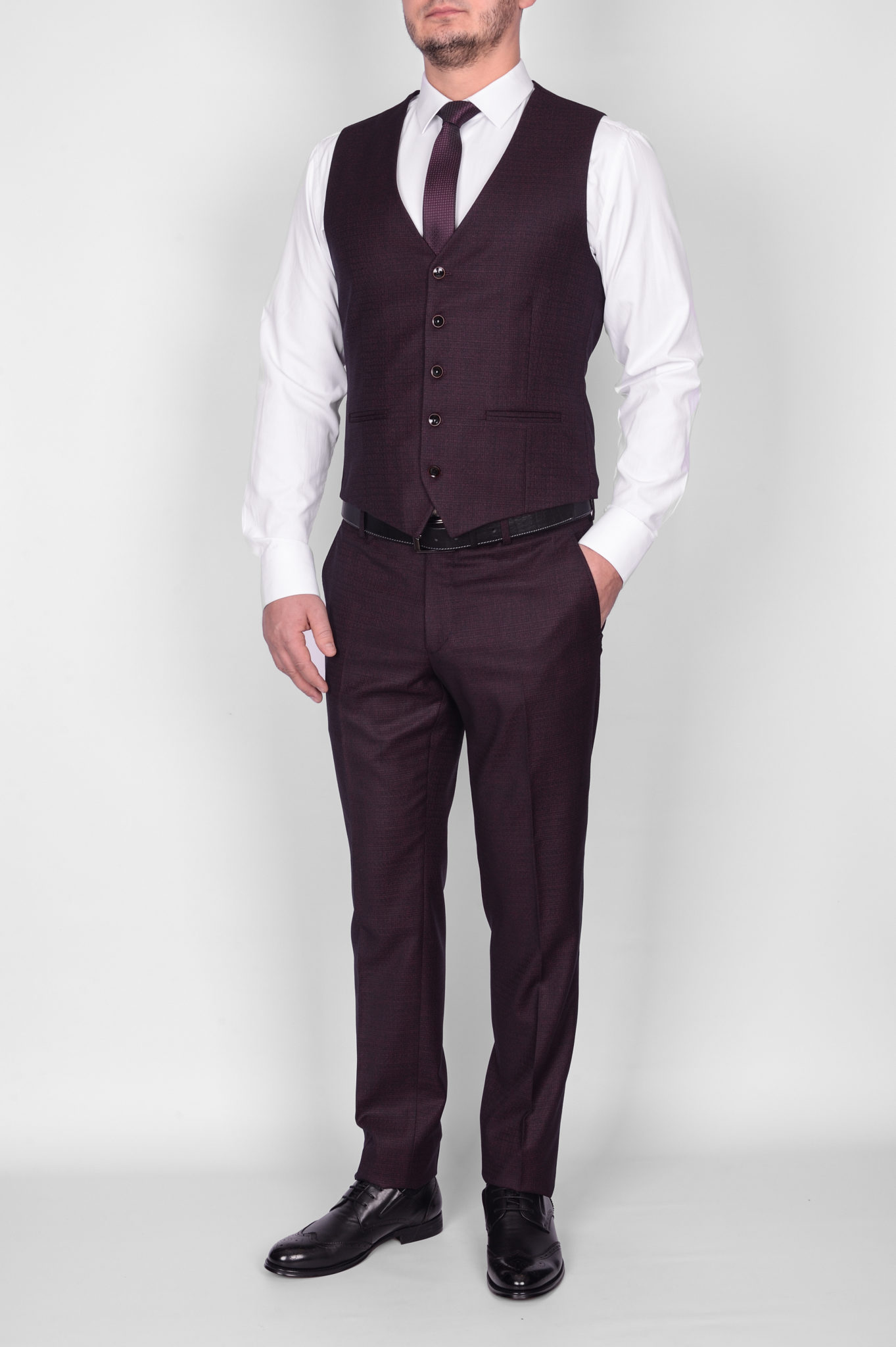 Костюм имеет замечательную посадку, отлично садится практически на любой тип фигуры. Данная модель отшита в очень красивом темно-бордовом цвете с вишневым оттенком, идеальный вариант для свадеб и любых торжественных случаев. Жилет костюма по спине также тканевый, что позволяет использовать его отдельно только с брюками.