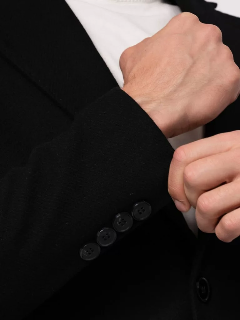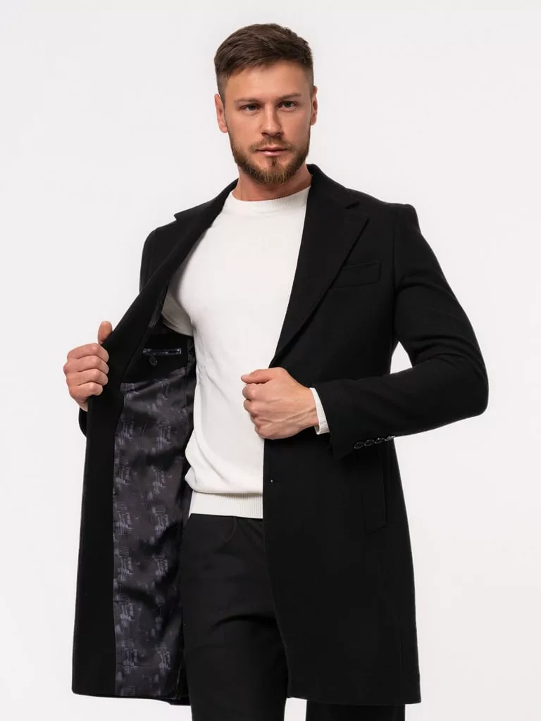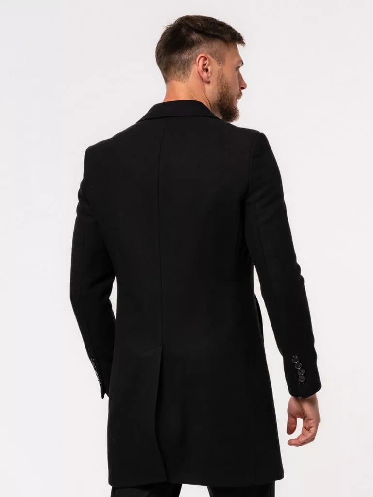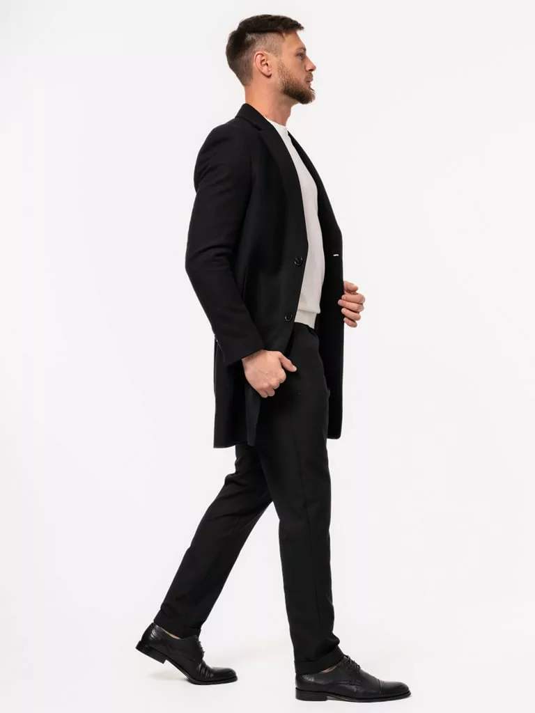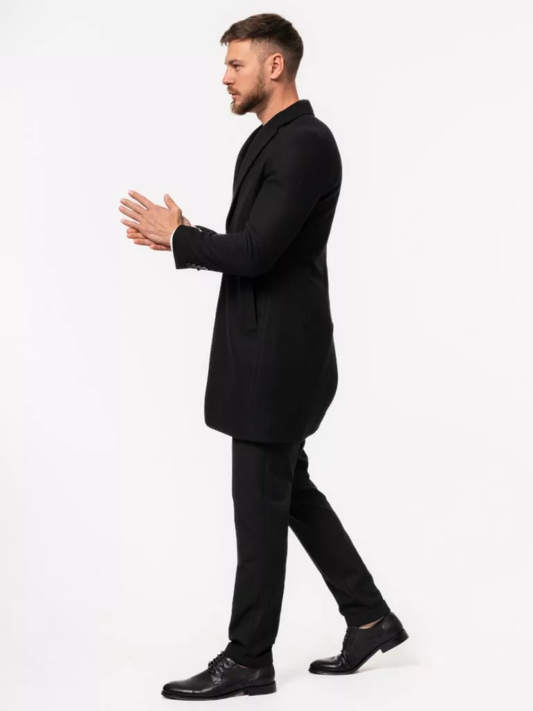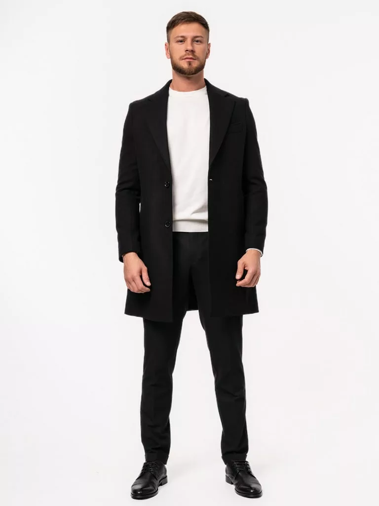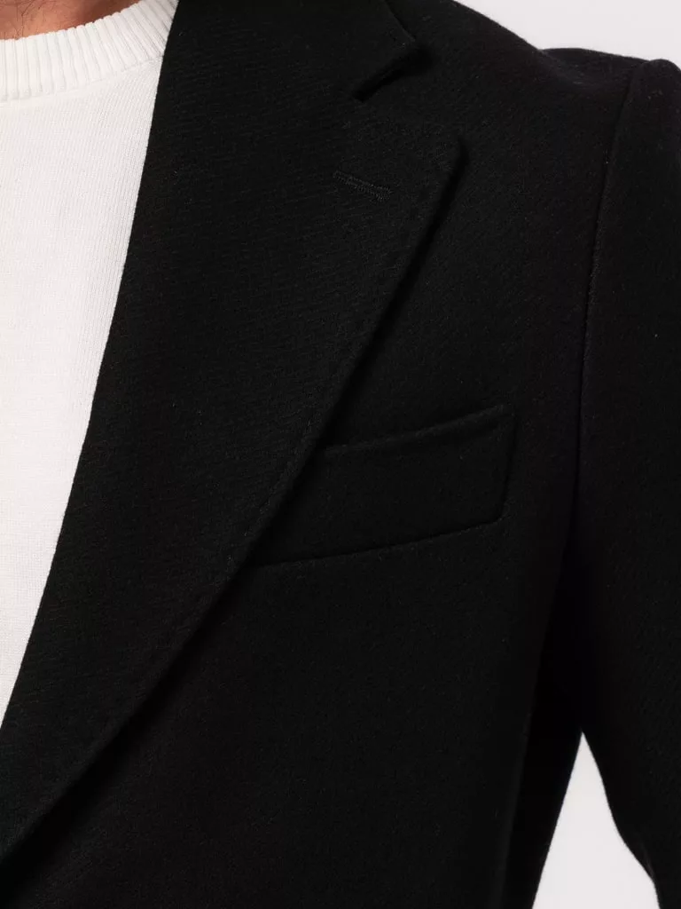 Пальто матово черное, полуприталенный силуэт, застежка на три пуговицы. Воротник стойка, раскладывается в английский. Пальто демисезонное с температурным режимом до +5 С.  Классическая , всегда актуальная модель, выполнена из очень мягкого материала в составе которого 80% шерсти и 20% вискозы. Универсальное черное пальто незаменимая вещь в гардеробе каждого мужчины.