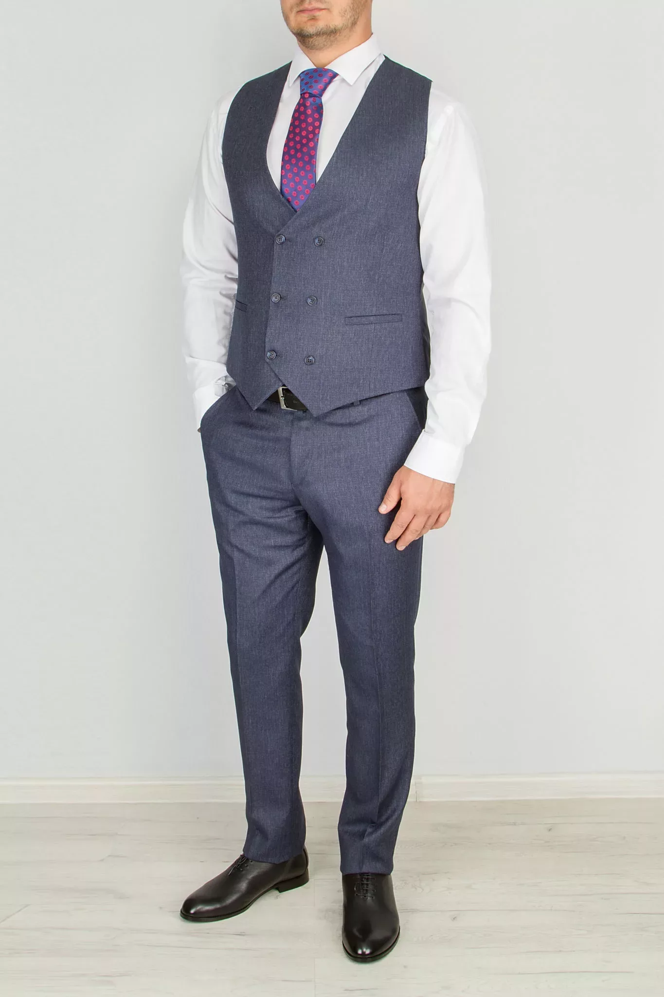 Костюм современного приталенного кроя, отшит в модели super-slim. Пиджак имеет застежку на одну пуговицу, узкий лацкан воротника, значек в петлице. Жилет двубортный с регулятором обьема. Брюки имеют узкий крой и свободную длину. По вашей просьбе мы подгоним длину брюк под вашу ростовку, заузим по ширине. Костюм отшит из смесовой ткани высокого качества в составе 62% шерсти и 35% вискозы и эластан 3%, что позволяет долго сохранять презентабельный внешний вид и форму, ткань устойчива к заминанию.