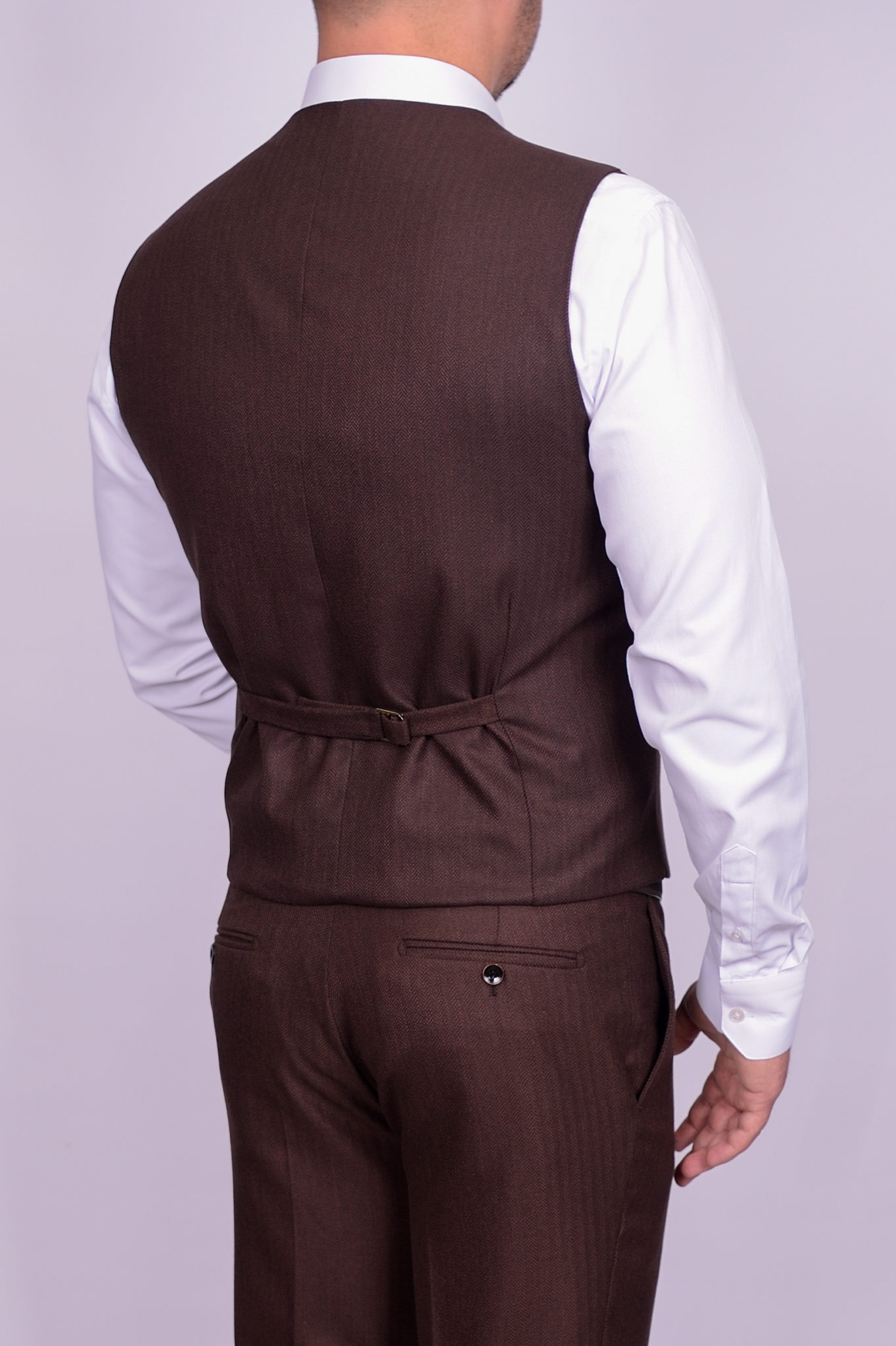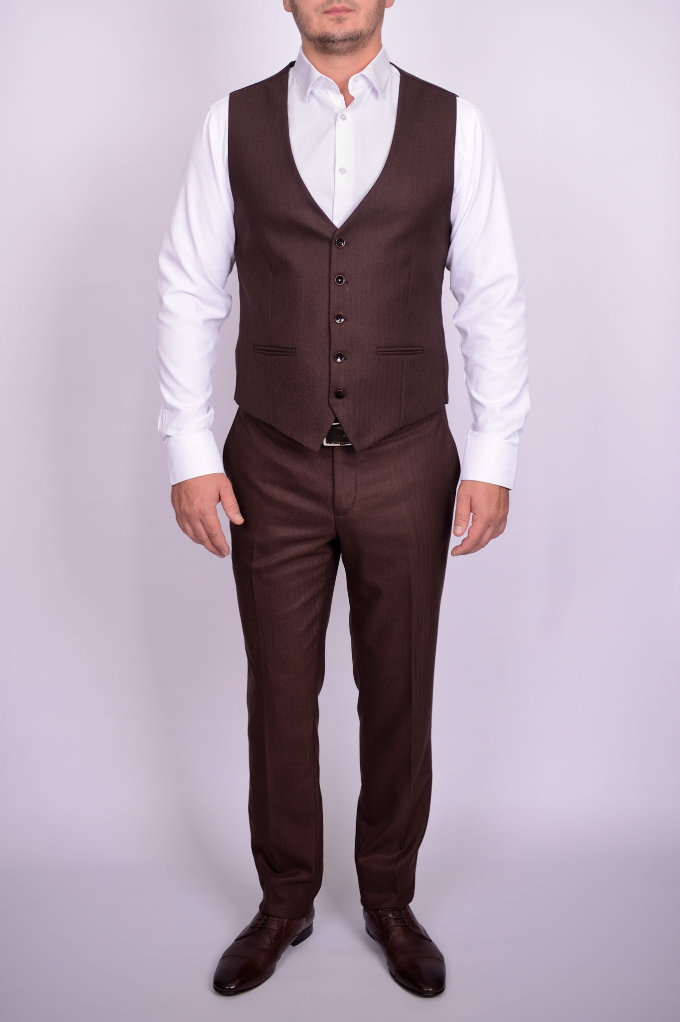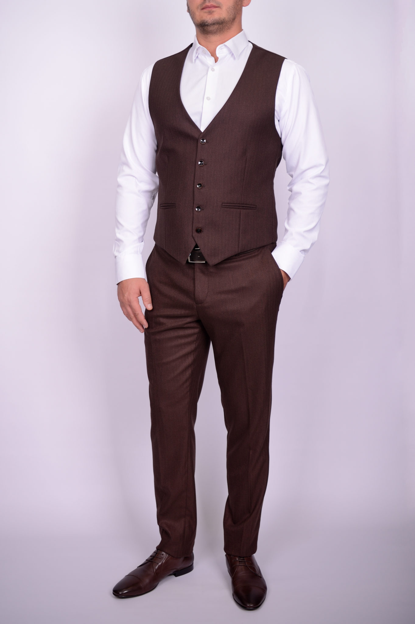 Костюм имеет замечательную посадку, отлично садится практически на любой тип фигуры. Данная модель отшита в очень красивом коричневом цвете с шоколадным оттенком, идеальный вариант для свадеб и любых торжественных случаев.  Жилет костюма по спине также тканевый, что позволяет использовать его отдельно только с брюками.
