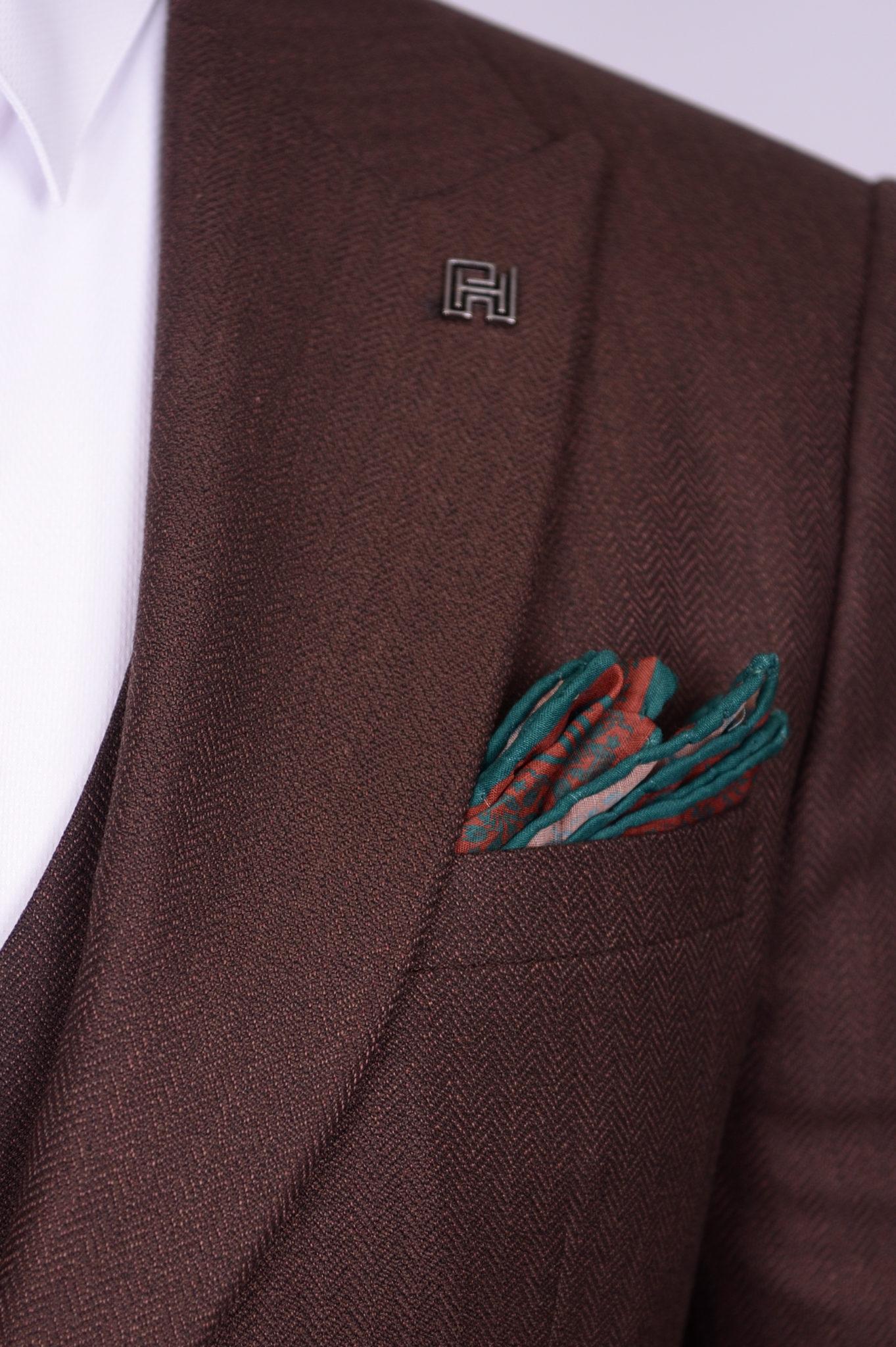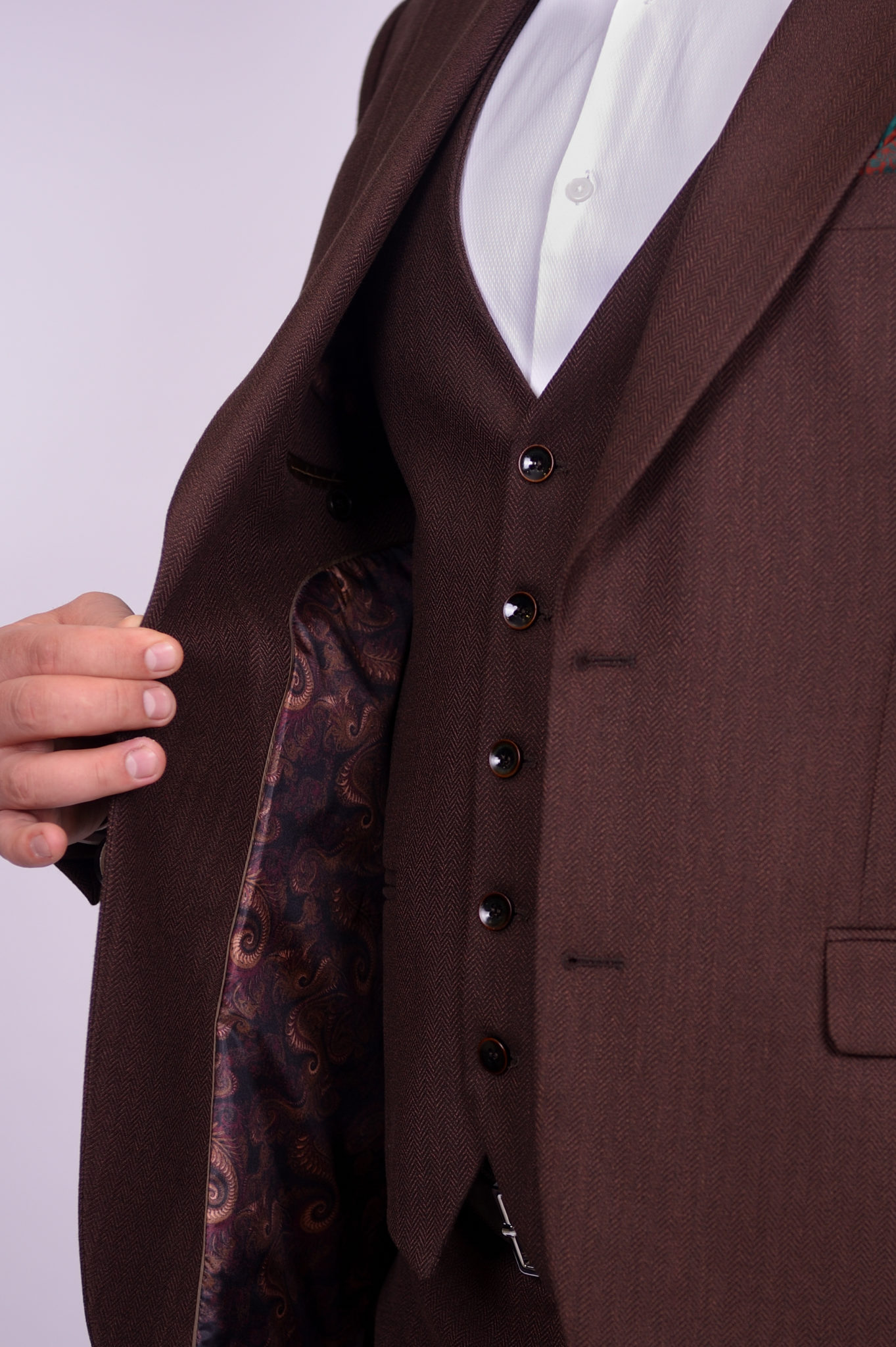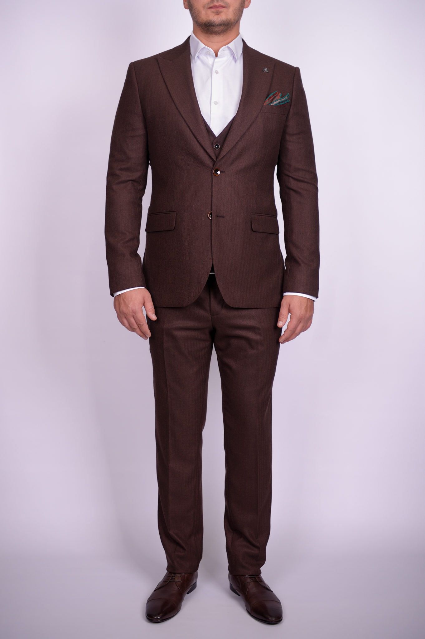 Костюм имеет замечательную посадку, отлично садится практически на любой тип фигуры. Данная модель отшита в очень красивом коричневом цвете с шоколадным оттенком, идеальный вариант для свадеб и любых торжественных случаев.  Жилет костюма по спине также тканевый, что позволяет использовать его отдельно только с брюками.