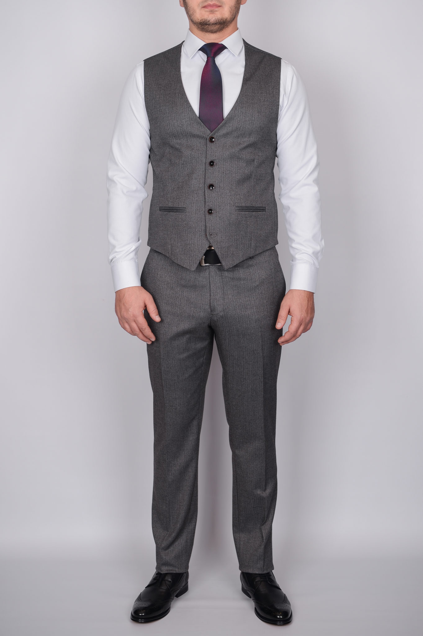 Костюм имеет замечательную посадку, отлично садится практически на любой тип фигуры. Данная модель отшита в красивом пепельно-сером  цвете, отлично подойдет для офиса и повседневной носки.  Жилет костюма по спине также тканевый, что позволяет использовать его отдельно только с брюками.