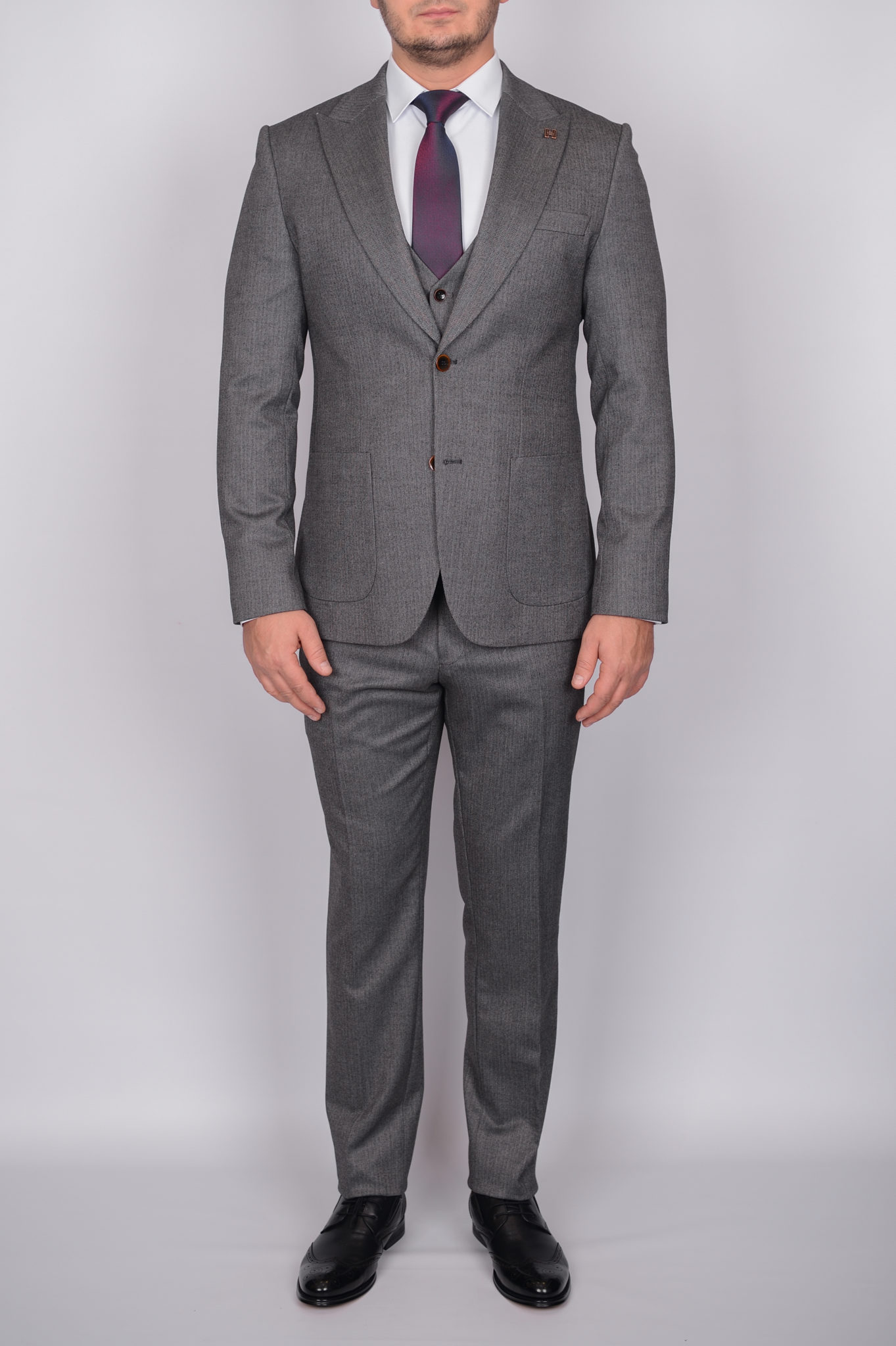 Костюм отшит в полуприталенной модели regular-fit. Пиджак имеет застежку на две пуговицы, лацкан воротника «заостренной» формы, нагрудный карман с листочкой, комплектуется платком, значек в петлице. Боковые карманы пиджака выполнены в форме накладных. Брюки слегка приужены, имеют свободную длину. По вашей просьбе мы бесплатно подгоним длину брюк под вашу ростовку. Костюм отшит из смесовой ткани высокого качества в составе 80% шерсти и 20% вискозы, что позволяет долго сохранять презентабельный внешний вид и форму, ткань устойчива к заминанию.