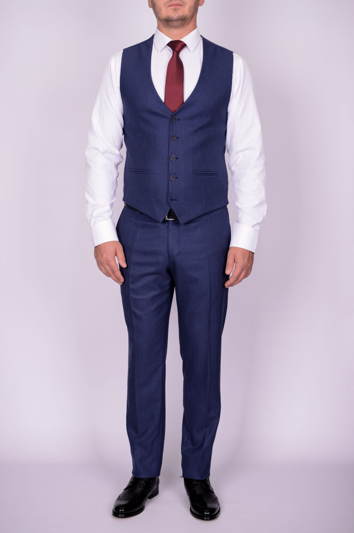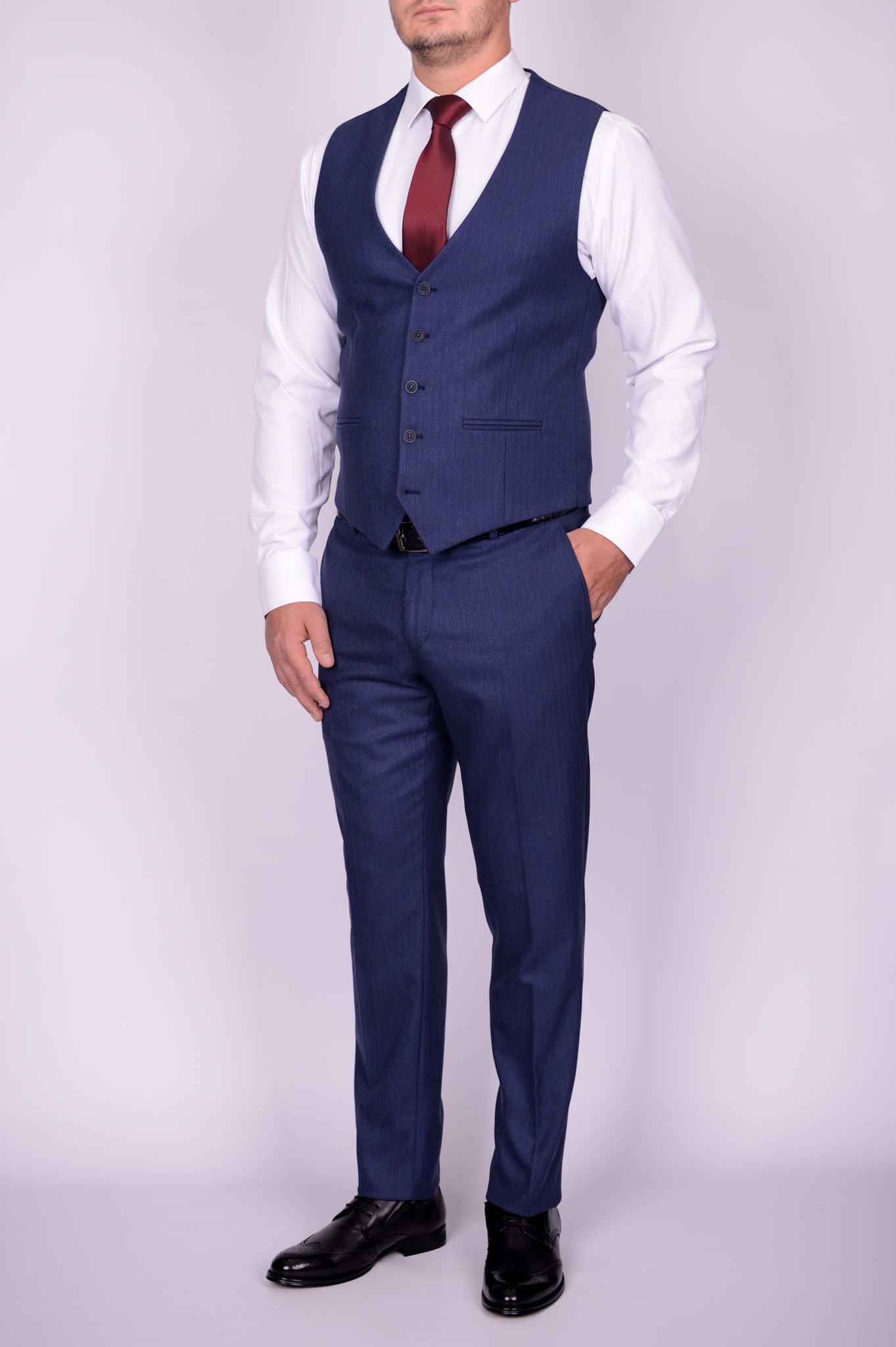 Костюм имеет замечательную посадку, отлично садится практически на любой тип фигуры. Данная модель отшита в красивом насыщенно-синем цвете, отлично подойдет для офиса и повседневной носки. Жилет костюма по спине также тканевый, что позволяет использовать его отдельно только с брюками.